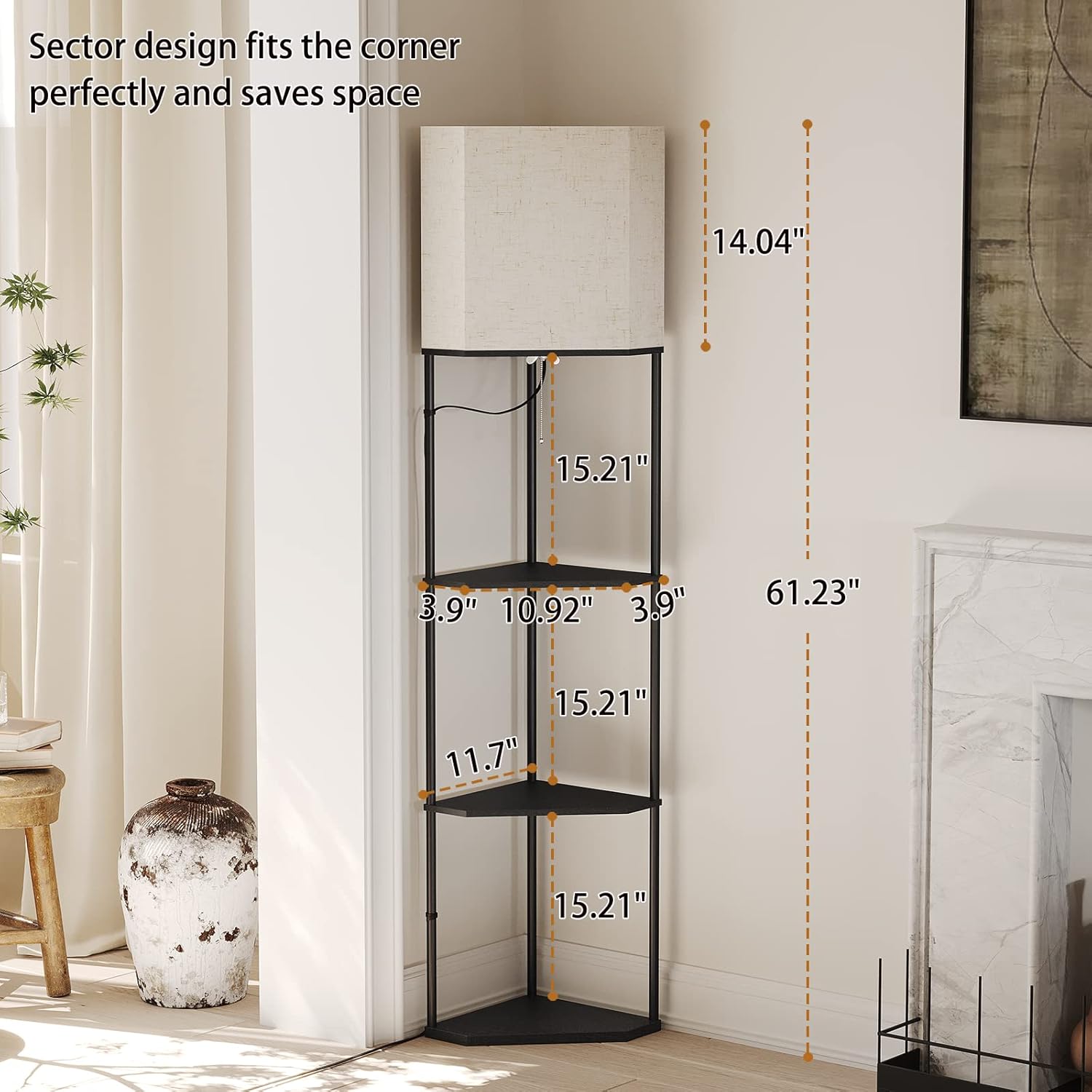 - 【Multi-function】 The corner floor lamps for living room adopts the design of top lamp + 3-layer fan-shaped shelf. It can not only be used as a floor lamp, but also can be used as a shelf or a display cabinet. You can also place some ornaments, photo albums, plants, books on it used as decorations while enjoying the light it brings.