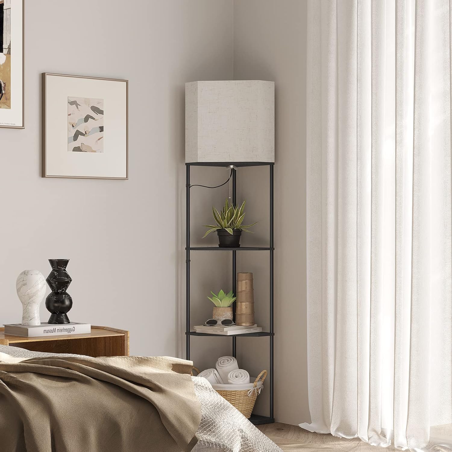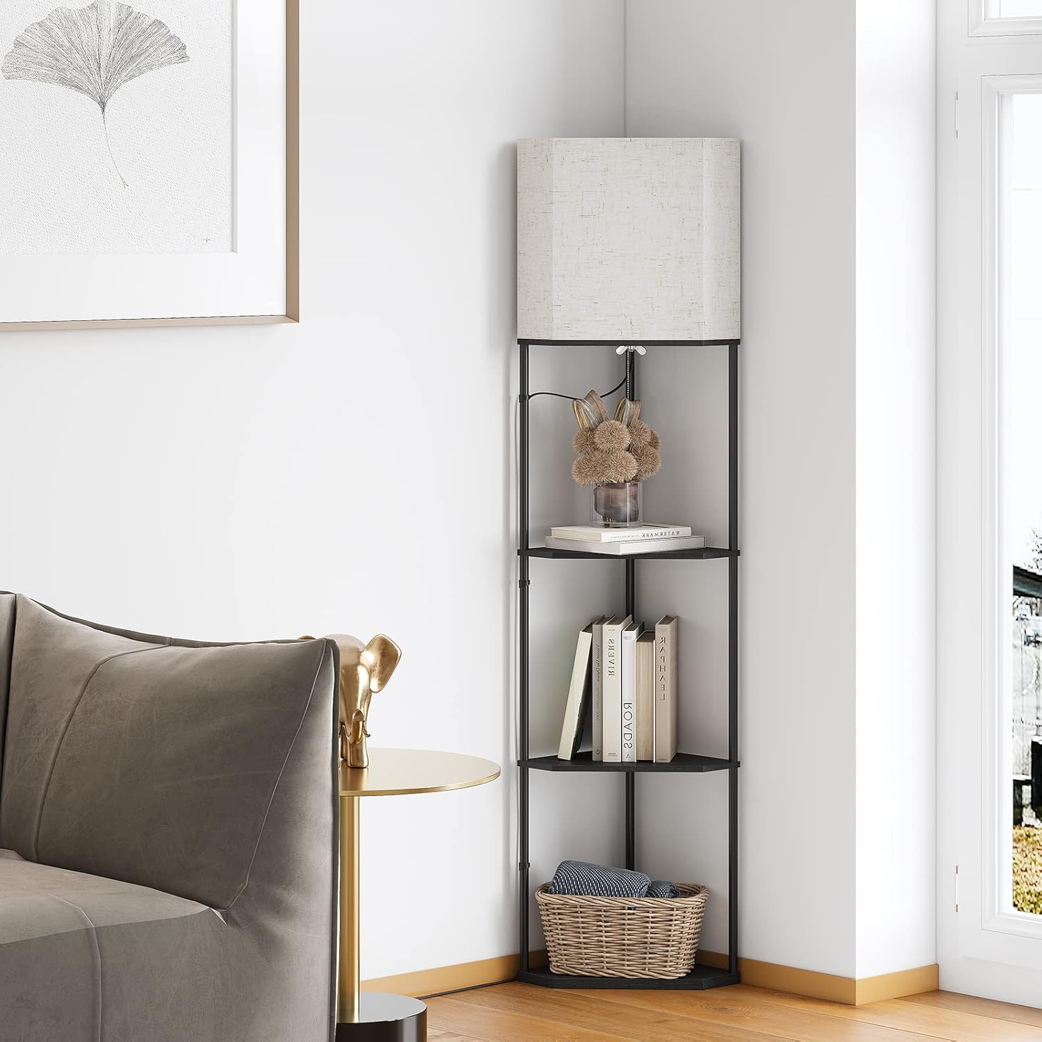 SUNMORY Sector Corner Shelf Lamp 3 Color Temperatures LED Bulb,Corner Lamps with Linen Lampshade, Floor Lamps for Living Room, Bedroom, Study, Black Standing Lamp with Shelves