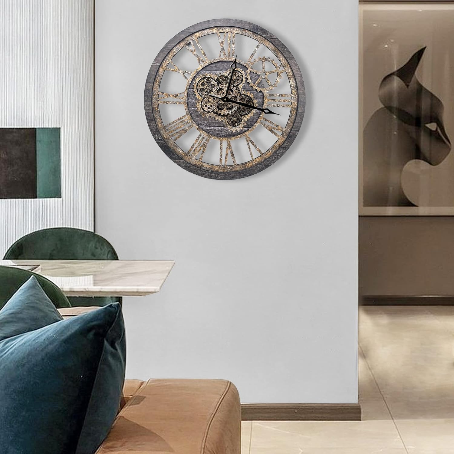 - REAL MOVING GEARS: Large wall clock with unique moving parts is as attractive as it is functional. Put batteries in, various gears start rotating fluently. Moving gear wall clock is amazing looking on the wall and will get so many compliments on it. Made from solid wood and painted by Rust-like color on wall clock create a very rustic and industrial atmosphere. Large farmhouse wall clock is professionally handmade and pursuit of naturalness, so it may have some little imperfections