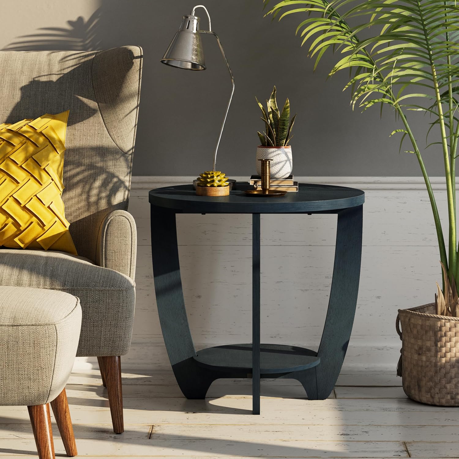 Rustic Farmhouse End Table with Storage Shelf, French Country Accent Side for Family, Dinning or Living Room, Small Spaces, Modern, Round, Vintage Blue Finish, Curved Leg