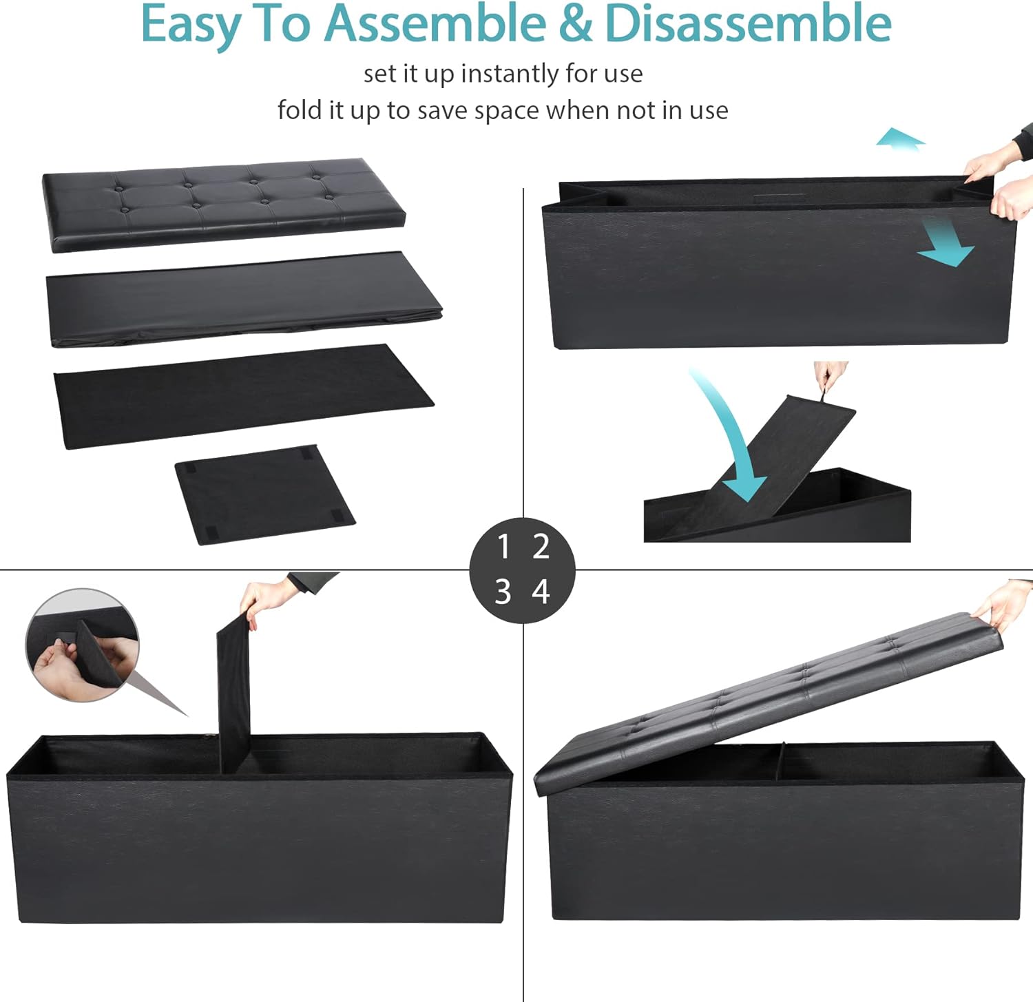 - Sturdy and Durable Materials - This comfortable long storage ottoman is made of quality thick cardboard, durable faux leather, has the load bearing capacity up to 660lbs. Waterproof soft faux leather, built-in thickened sponge, make the cushion is soft and comfortable. Black unit you see everywhere and a perfect match to your couch or dining room chairs