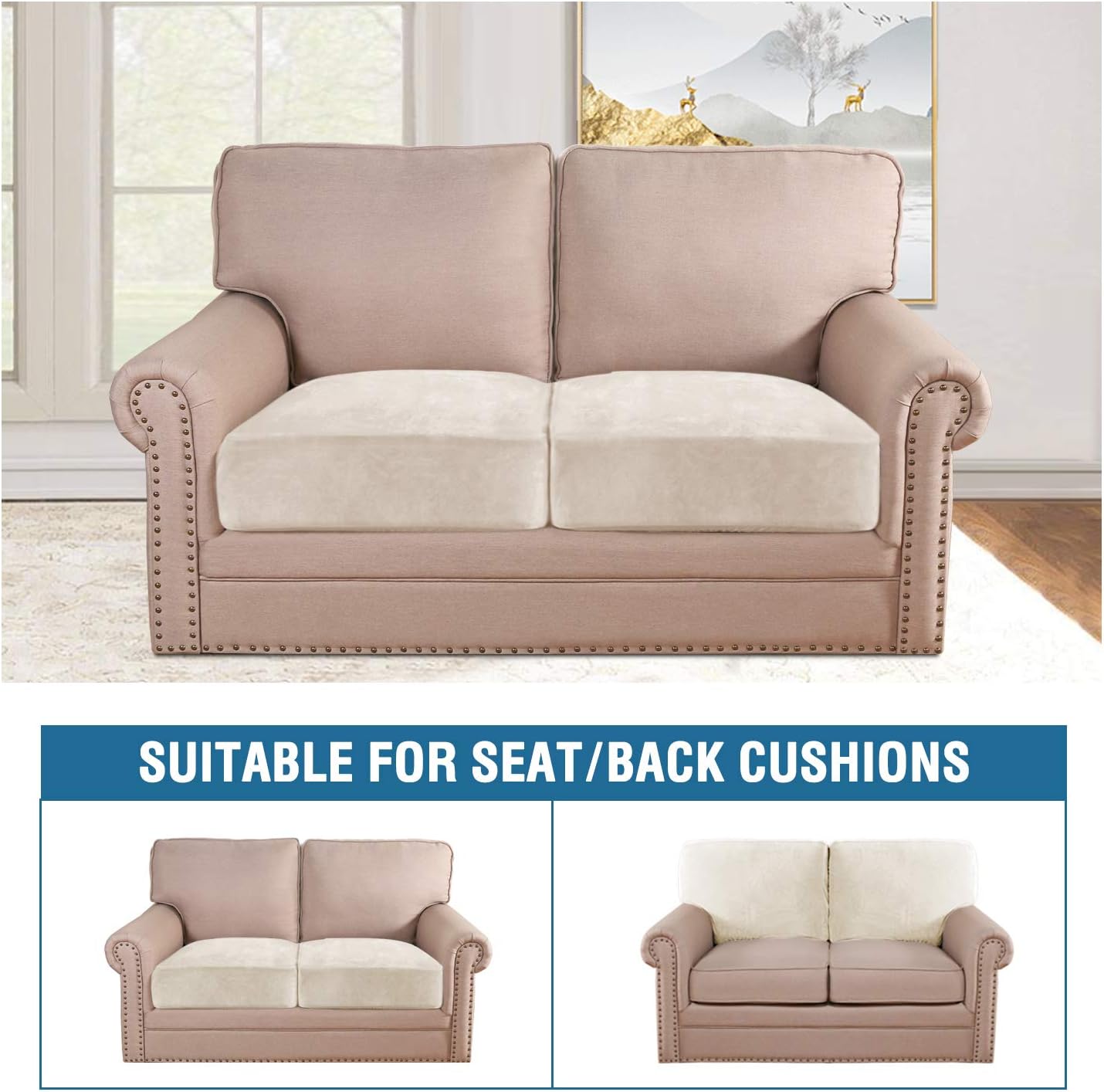 H.VERSAILTEX Velvet Stretch Couch Cushion Cover Plush Cushion Slipcover for Chair Loveseat Sofa Cushion Furniture Protector Seat Cushion Sofa Cover (2 Piece Large Sofa Cushion Covers, Ivory)