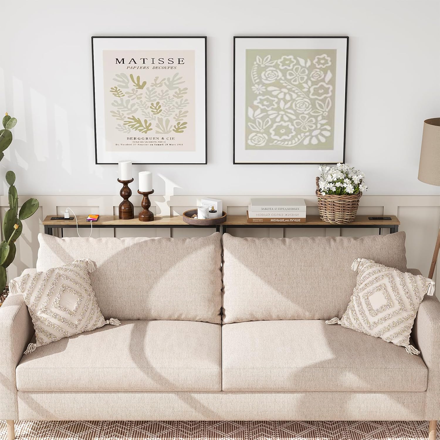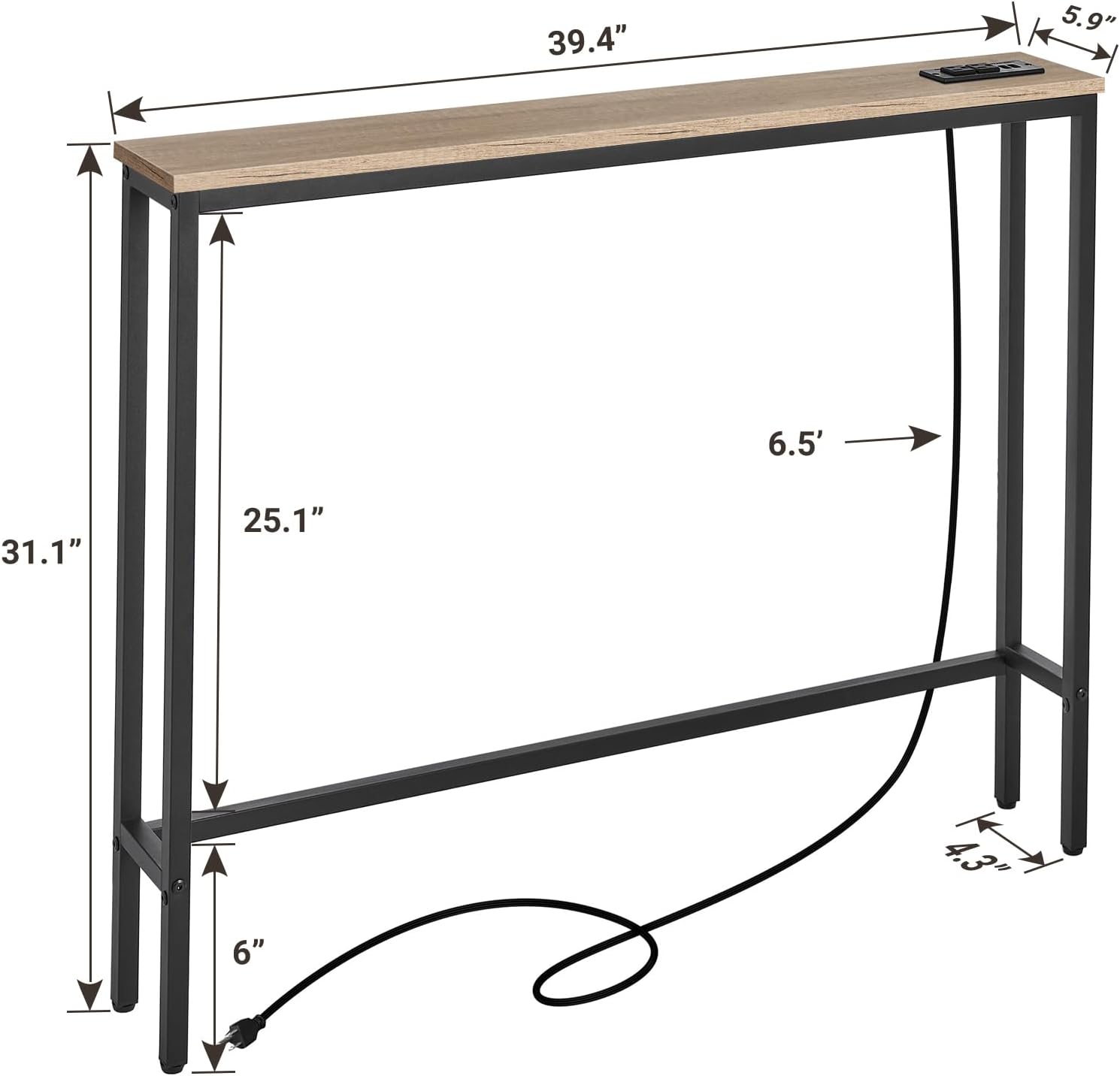 - Back Sofa Table with Outlets: The narrow long table with 2 standard 120VAC outlets, 2 USB ports and 6.5 feet long power cord to rescue the socket behind the sofa to charge the laptop/mobile phone