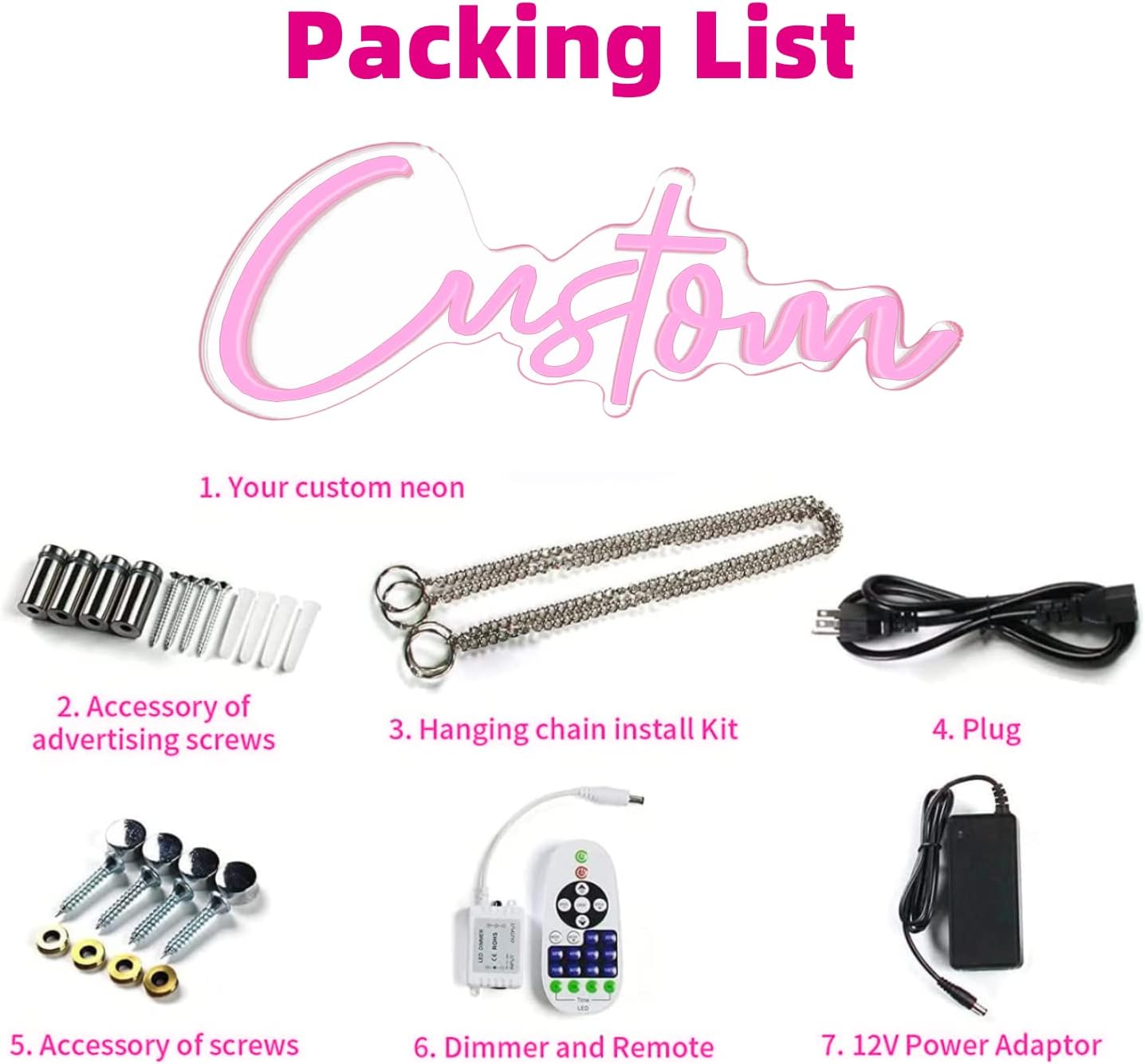 - Custom Neon Sign---neon sign could be used in the wall, room decor , bar, birthday, weddings, parties, anniversaries, other celebration occasions and more.Use your own elements to create your unique style atmosphere. Color, size, font, number of lines of your text, backboard color and cutting shape are your choices. Accessories can also be selected