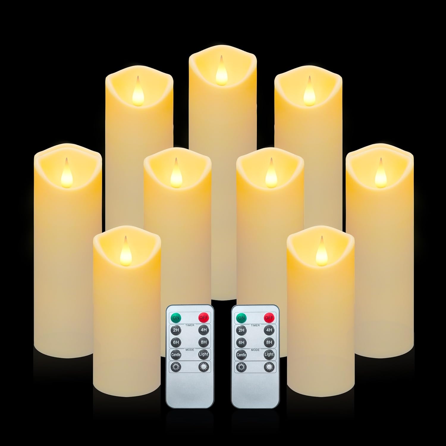 Aignis 9pcs Flameless LED Candles Battery Operated with 10-Key Remote & Timer, Indoor Heat Resistant, 3D Wick with Warm Flickering Glow for Cozy Home/Wedding/Holiday Décor (D 2.2" x H 5"/6"/7")
