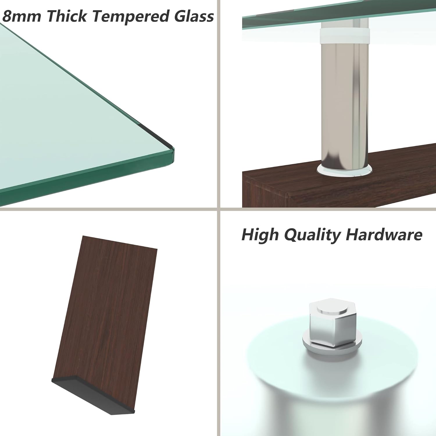- Tempered Glass Coffee Table - The thickness of top glass is 8mm, the second layer is 5mm. Walnut color metal leg is stronger. Living room table's weight capacity - 220lbs.