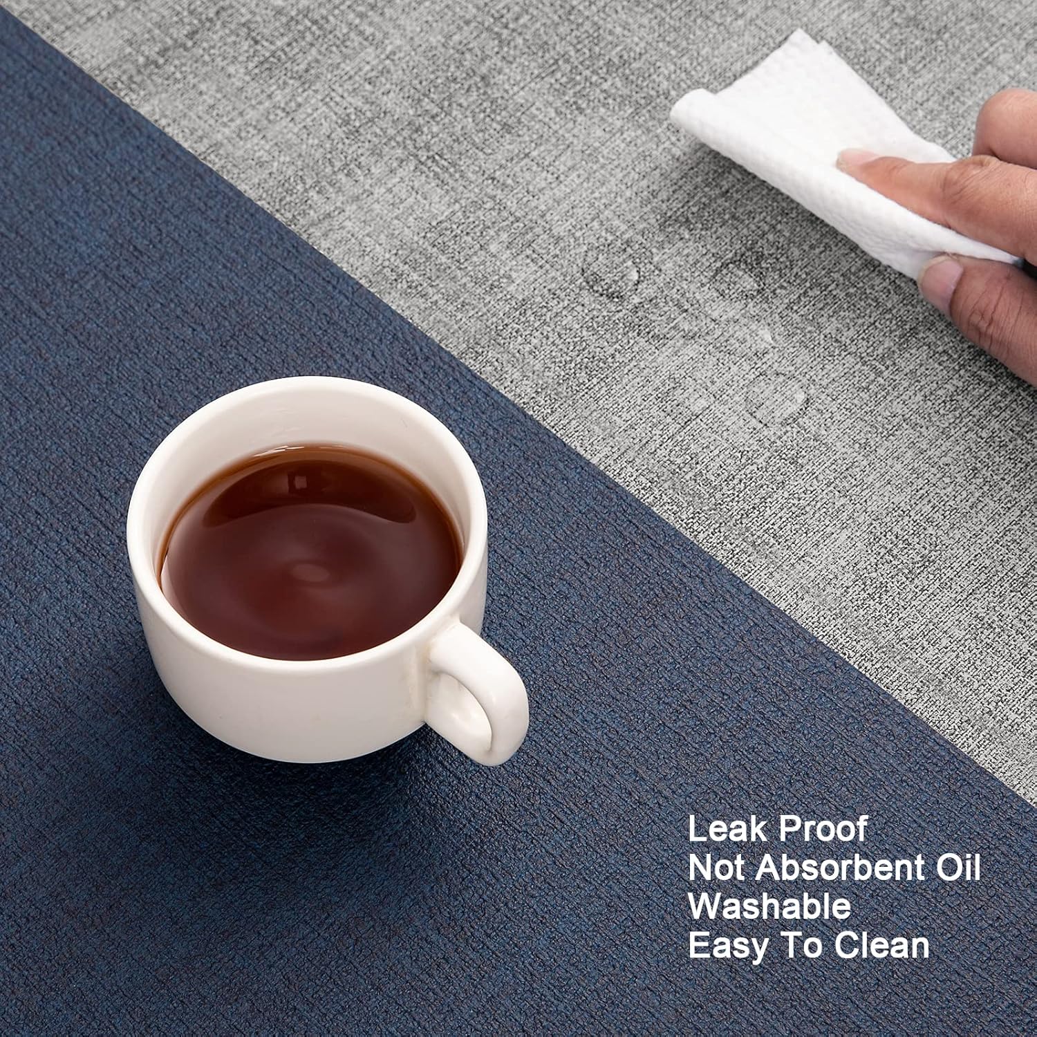 - These placemats are made of faux leather, the sufface texture imitate the linen. Unlike woven or fabric placemats, these placemats are water resistant, they can block the sauce or any liquids to protect the desktop.