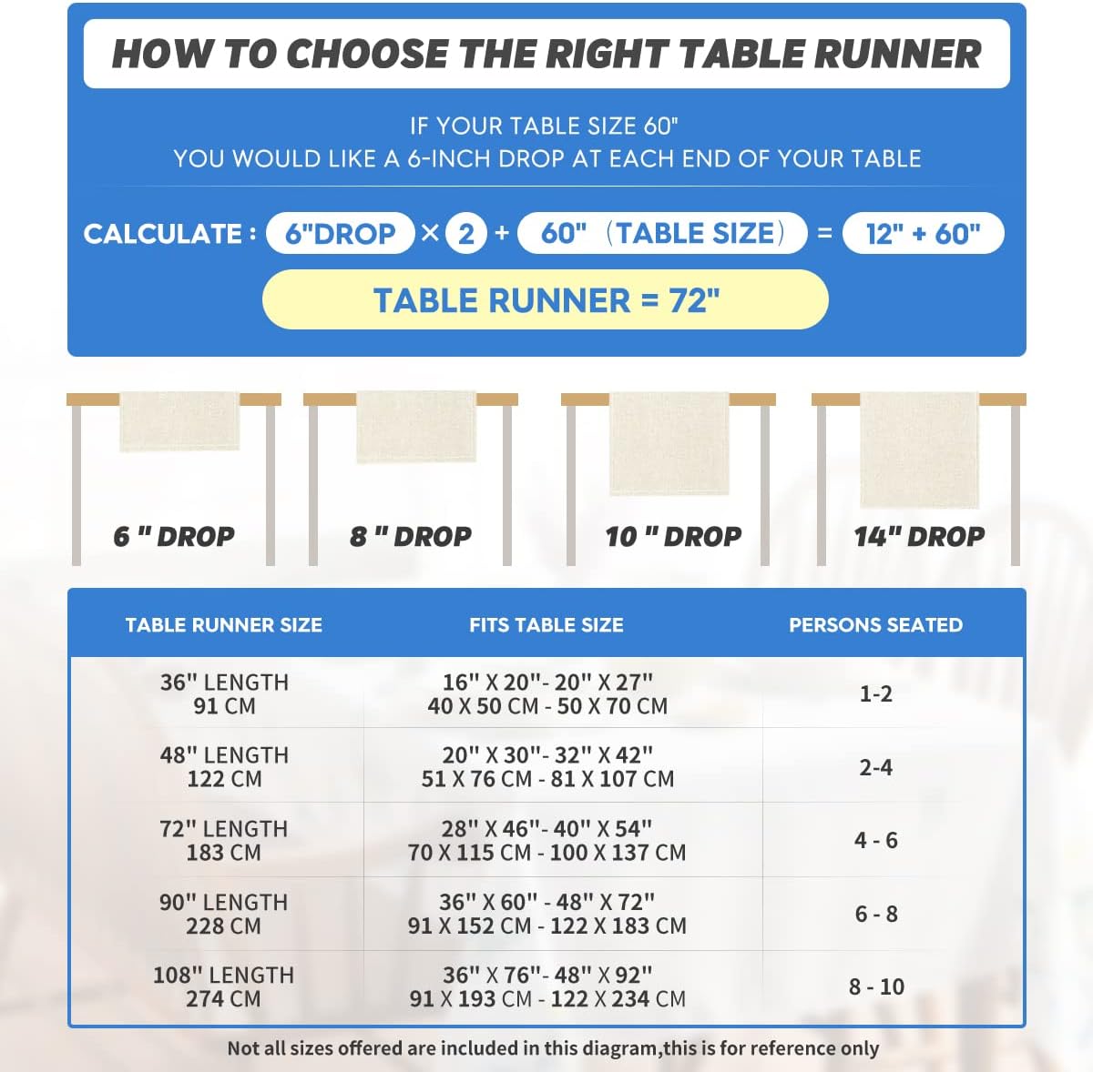- Fits Table Size : This table runner is 13 x 120 inch, appropriate for a table that can seat 10-12 people, better match your table and give you a delightful dining experience