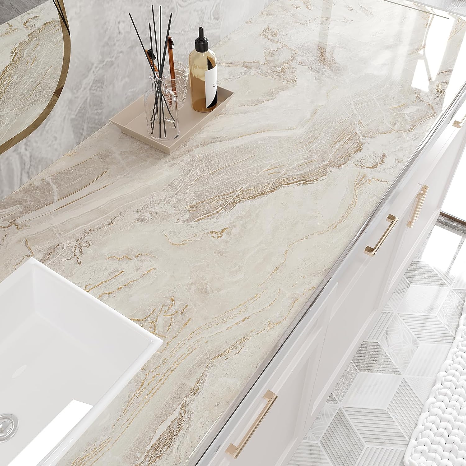 - SIZE& MATERIAL: This marble countertop contact paper is 15.7 inches wide by 118 inches long, coverage in 13 square feet each roll. Made of high quality vinyl, thick, durable, matte finish, elegant beige gold marble look