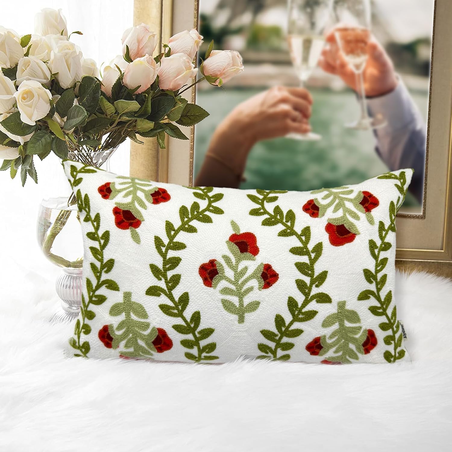 Alysheer Floral Embroidered Summer Lumbar Decorative Throw Pillow Cover 12"x 20", Farmhouse Cottage Red Flowers Green Leaves Patterned Cotton Canvas Cushion Case for Sofa Couch Bed Living Room Decor