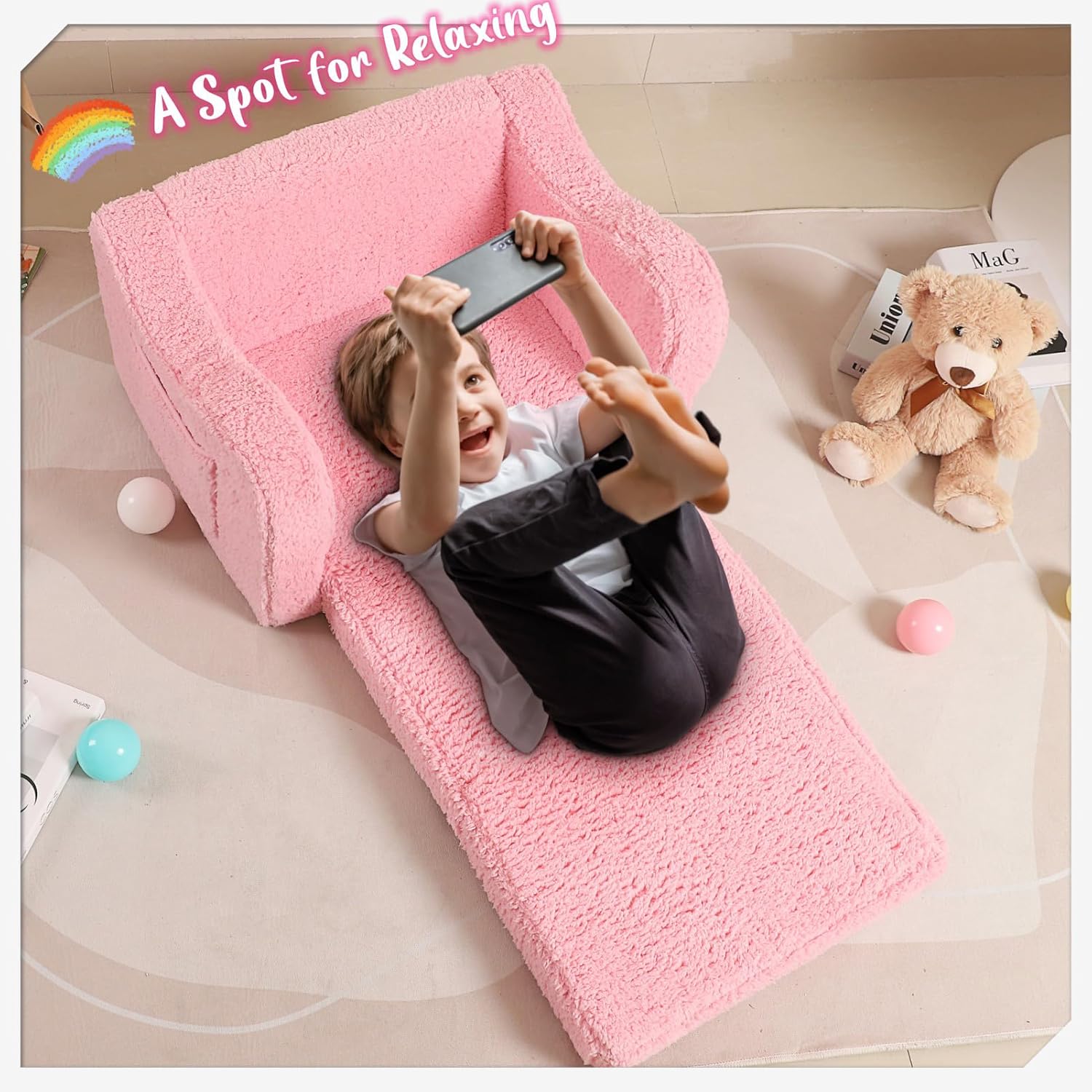 Kids Chairs for Toddler, 2-in-1 Toddler Soft Sherpa Couch Fold Out, Convertible Sofa to Lounger for Girls and Boys, Pink