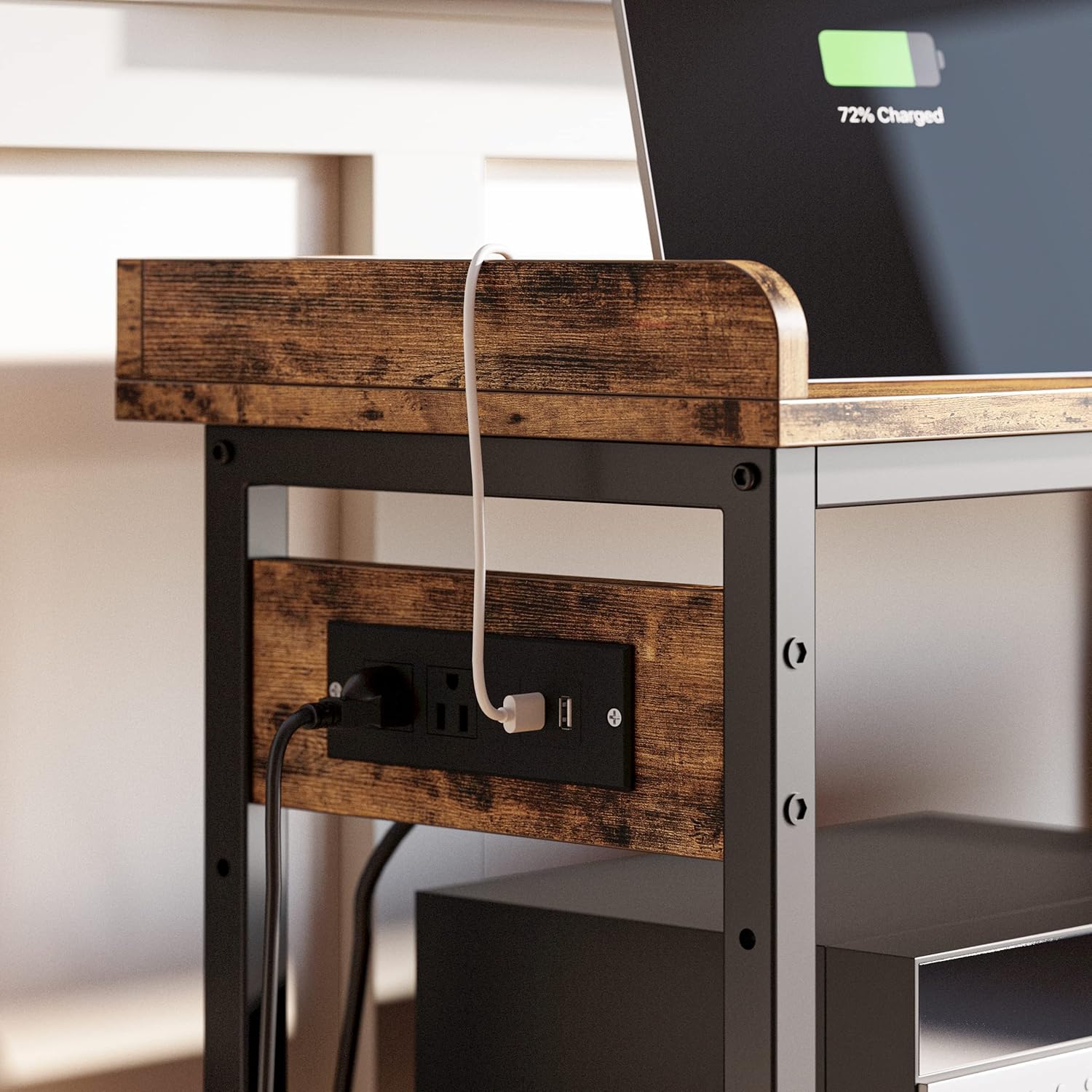 - Narrow Console Table with Charging Station: With two outlet plugs and two USB ports built in , IRONCK sofa table allows you to charge your phone, tablet, laptop, and lamps within easy reach.The outlet could be settled on the left or right side