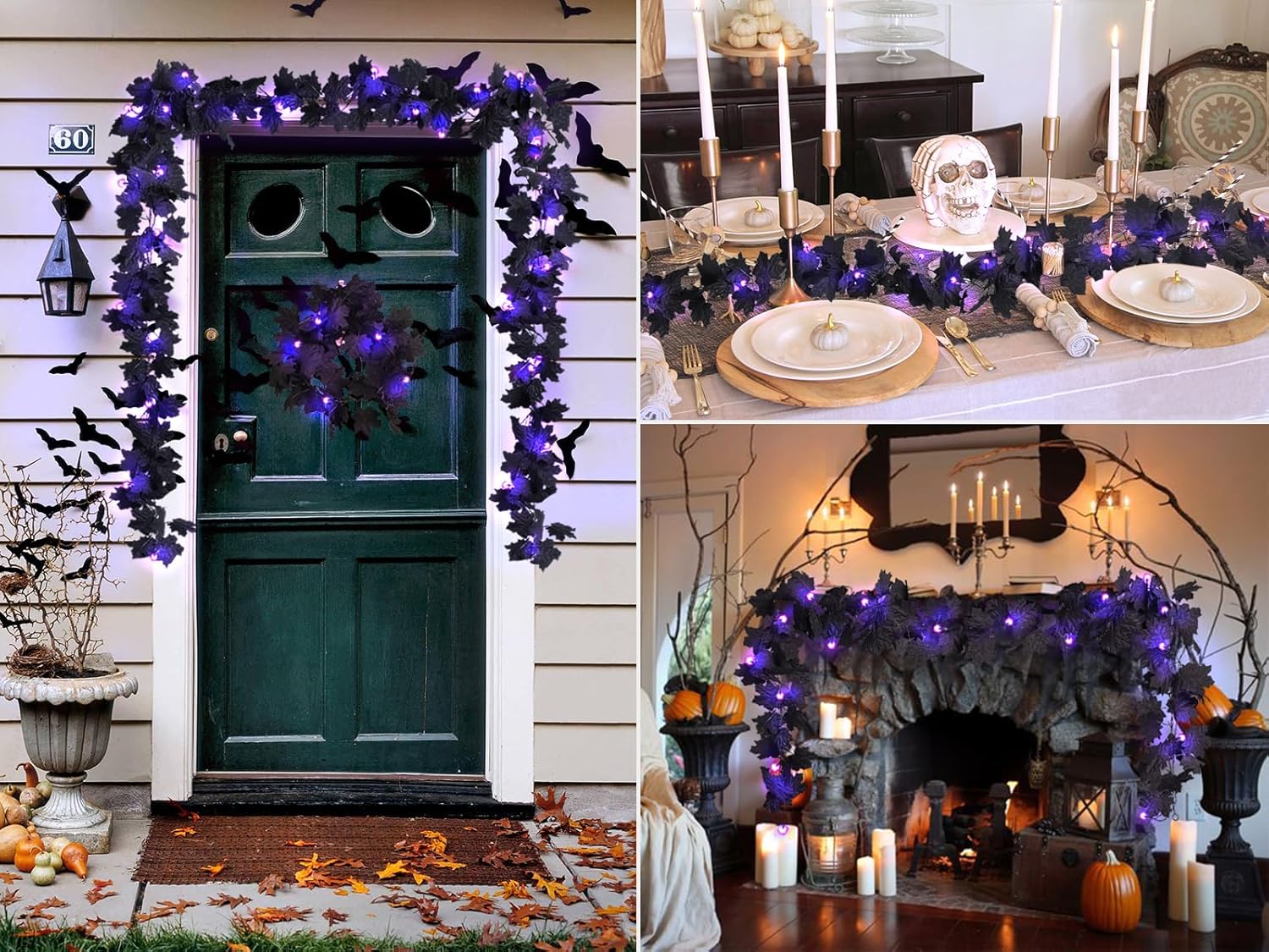 - 【Halloween Party Decorations】: Black garland with Lights represent mystery and create a mystery atmosphere for your autumn theme parties, Harvest Festival decor, Christmas parties.Black garland can also decorate balcony, table top, mantel, fireplace, doorframe, doorway, stair banisters. Maple leaf vines can be bent. You can combine 2 maple vines to make them more fluffy and create a gorgeous visual effect.