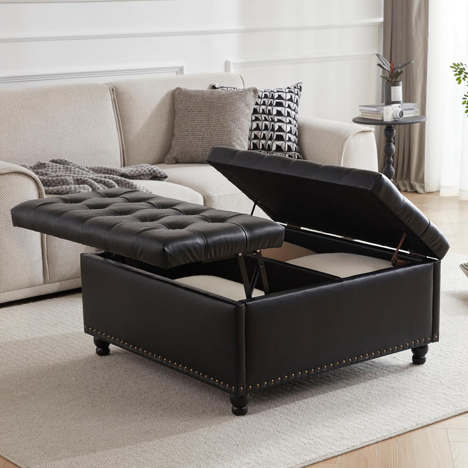 Tbfit Large Square Storage Ottoman Bench, Tufted Upholstered Coffee Table Ottomans with Lift Top & Solid Wood Legs, Oversized Storage Ottomans Toy Box for Living Room (Black)