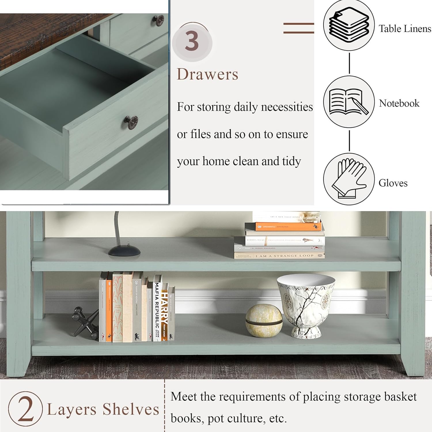 - 【Multifunctional Console】 This console can be used not only as a porch table and sideboard, but also as a sofa table, porch table and buffet table. You can put it in the kitchen, bedroom, hallway, living room, office, etc. A space-saving desk can help you organize your supplies and keep your room clean and organized.