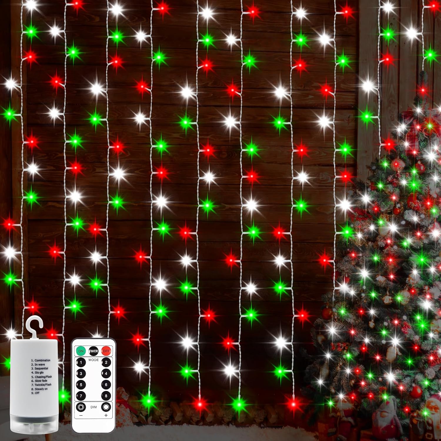 echosari Red White and Green Christmas Curtain Lights Battery Operated, 300 LED Fairy Curtain Lights 9.8Ft x 9.8Ft Hanging Lights with Remote Timer for Party Holiday Garden Yard Decor
