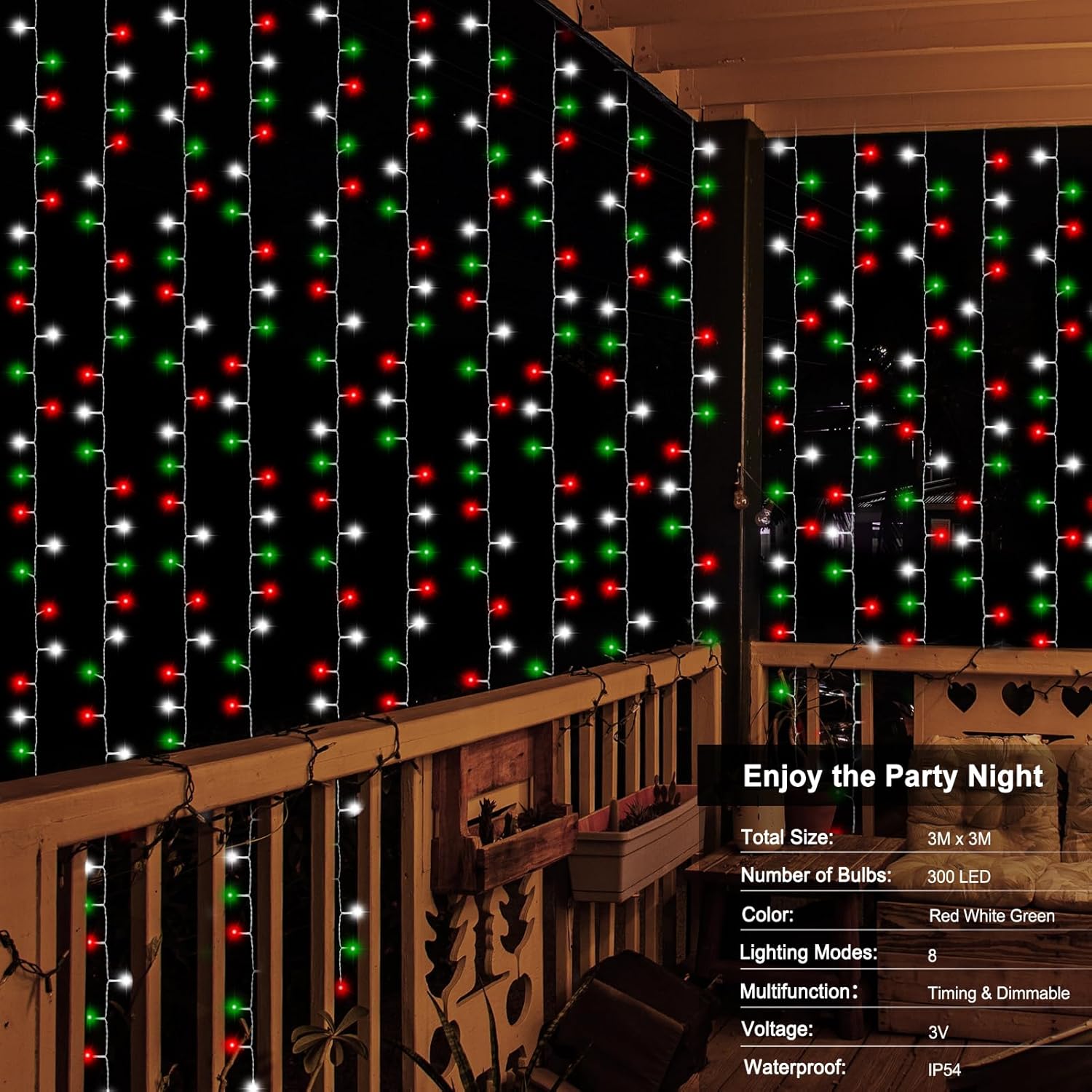 - Christmas Window Curtain Lights: Add a wonderful Christmas wall backdrop as you decorate for your event with this 9.8ft.x9.8ft 300 LEDs red white green curtains lights and extra 1.6ft long lead wire. The wire drop strings is tough & flexible, hanging & adjustable desired height naturally easily. No limits to your imagination