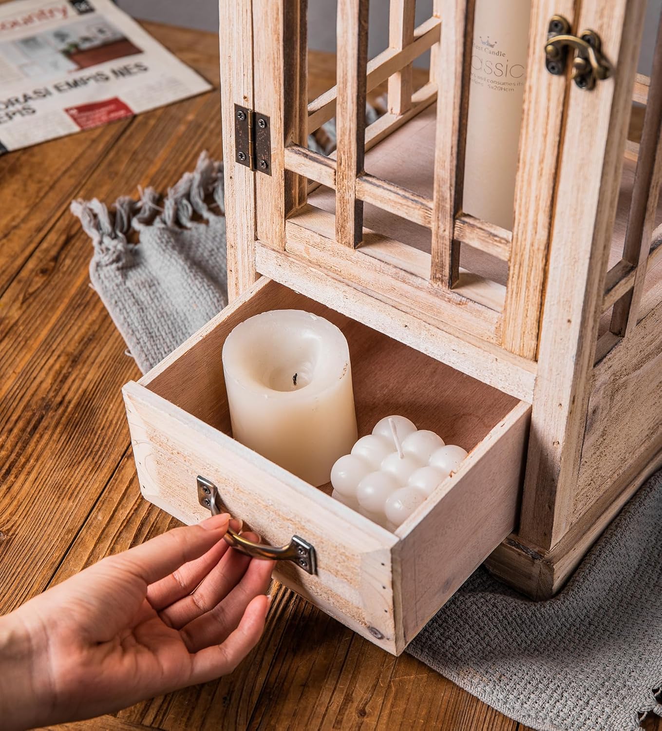 - VINTAGE RUSTIC CHARM β Featuring a simple handy drawer, this country style wooden lantern set not only serves as convenient storage to organize any clutter but also offers an unique modern farmhouse appearance to your home.