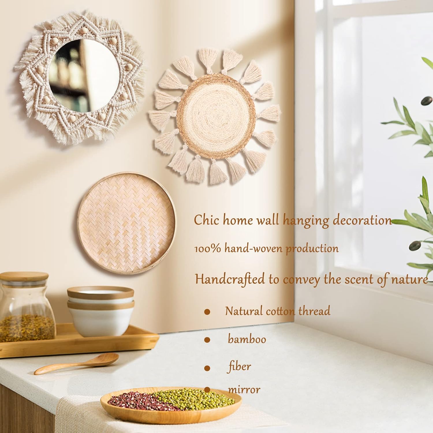 - 【Value Combo Set】:The product is a combination of boho macrame mirror and tassel placemat pendant with bamboo tray woven wall basket decoration, combined into an beautiful set of decorative aesthetic wall art.