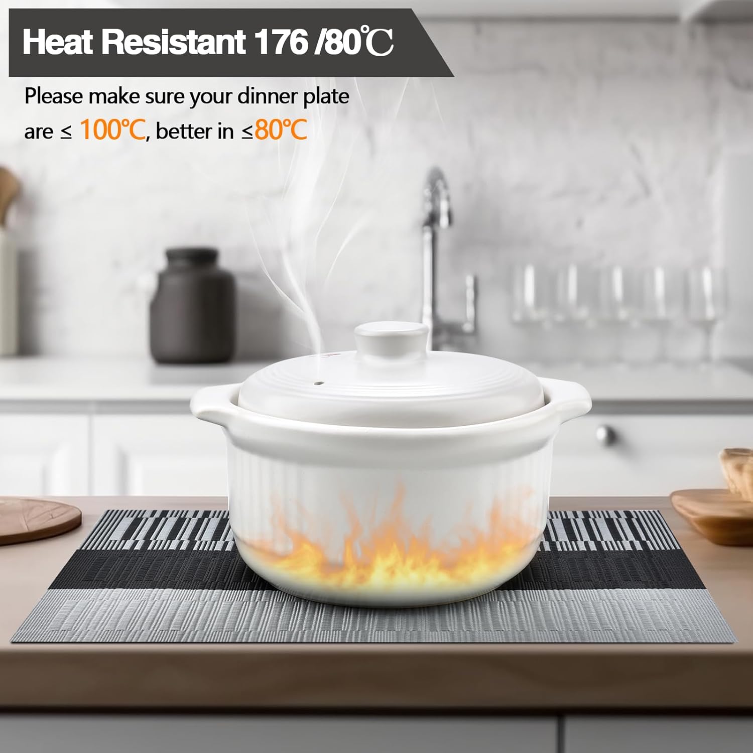 - Heat Resistant: Please make sure your dinner plate are ≤ 100℃, better in ≤80℃. It can prevent the table from slipping and scalding the countertop. These beautiful stylish vinyl place mats to add more fun to your dining table