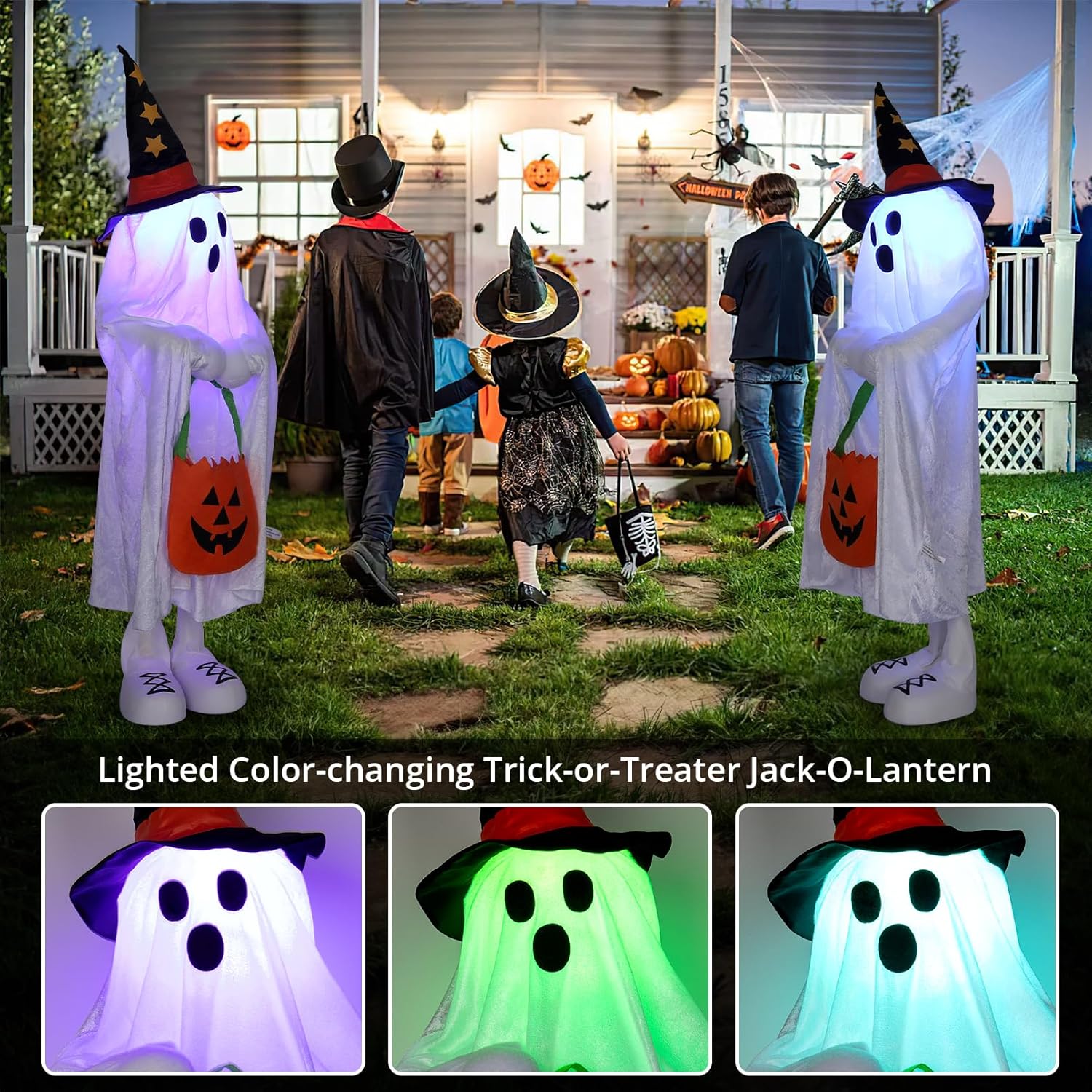 - Halloween Ghosts Porch Decor: This Halloween decoration features a 38-inch tall Ghosts with its captivating Color Changing LED lights and adorable candy pocket, this decoration is the perfect addition to your porch, yard, or even indoors.3 AAA batteries(Batteries not included).