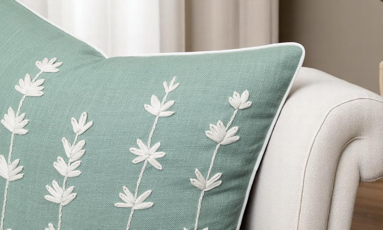 VAGMINE Hand Embroidered Daisy Accent Throw Pillow Cover - 20x20 Inches Square - 100% Cotton Light Teal Decorative Cushion Cover for Couch, Sofa, Bed - Textured Embroidery - Elegant Floral Home Décor