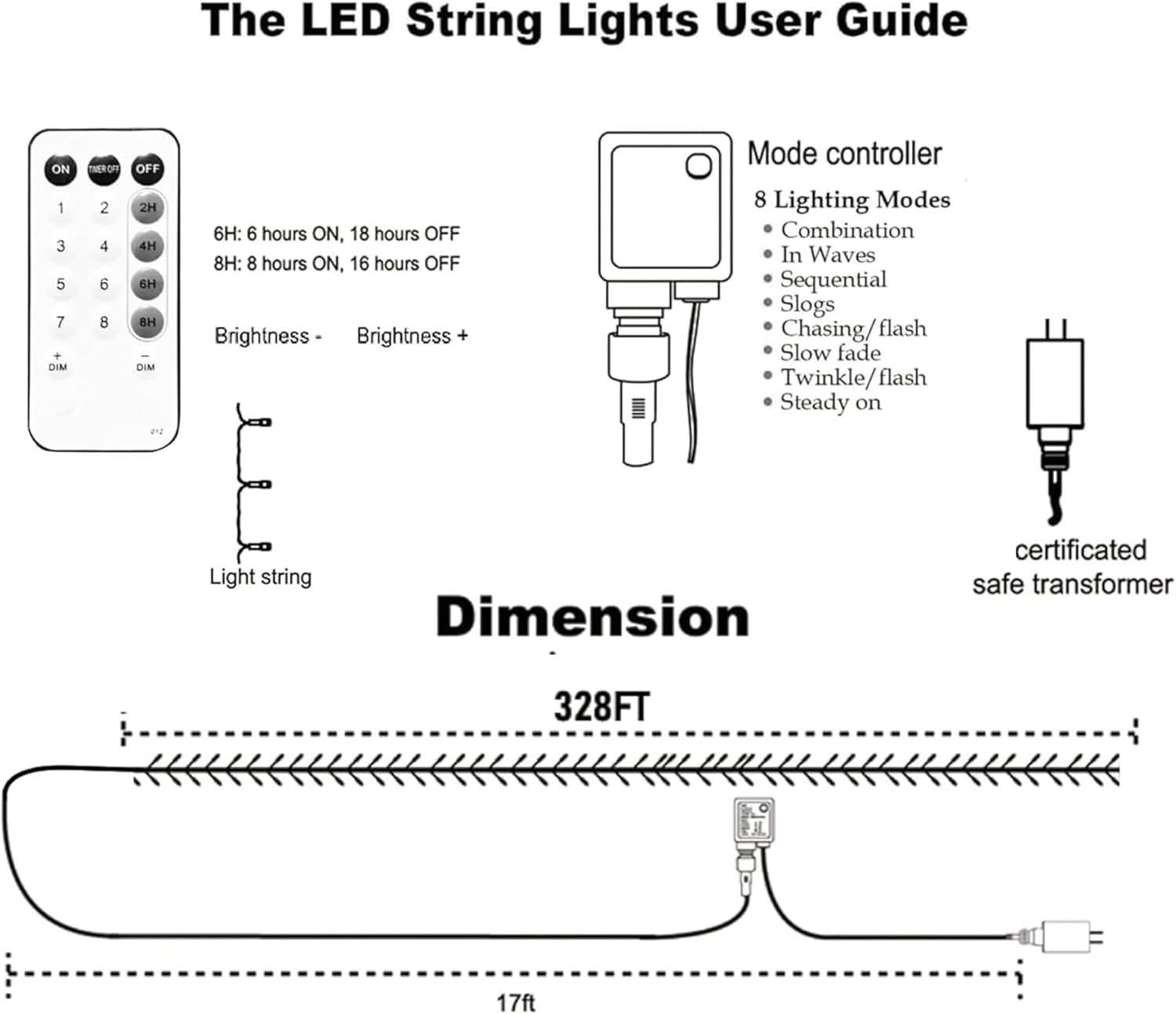 - Remote Control: The Christmas string lights can be controlled with wireless remote, you can set different, modes, timer, brightness, etc. There are 8 lighting modes (combination, in waves, sequential, slo-glo, chasing/flash, slow fade, twinkle/flash, steady on). It also has 4 timer modes, "2H" (2 hours on/22 hours off), "4H" (4 hours on/20 hours off), "6H" (6 hours on/18 hours off), "8H" (8 hours on/16 hours off).