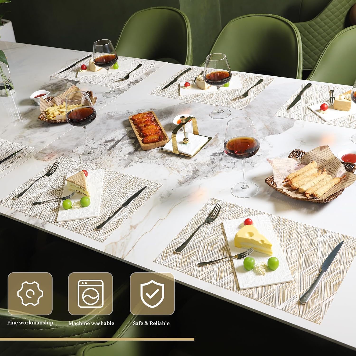 Vinyl Plastic Placemats Set of 6 Washable Heat Resistant Non-Slip Elegant Indoor Outdoor Kitchen Dining PVC Woven Table Place Mats (Gold Yellow Rhombus)