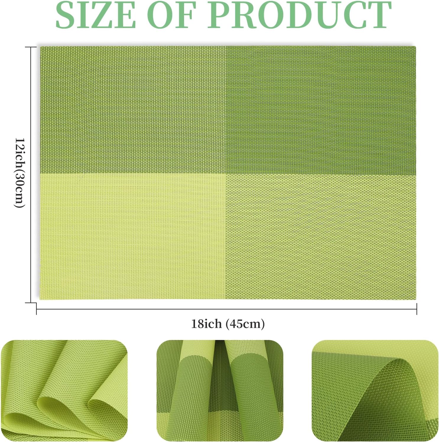 - 【Home Practical Decor】: Various types of modern textured and color placemats are available, 18x12 inch extra large rectangular perfect size set of 6 pieces placemats, is a decorative accessories of the table setting, both indoor and outdoor will be perfect for your dish or dinner plate size. These placemats can be rolled up through long storage and put away, will remain stay flat when spread out, very easy to store and carry around
