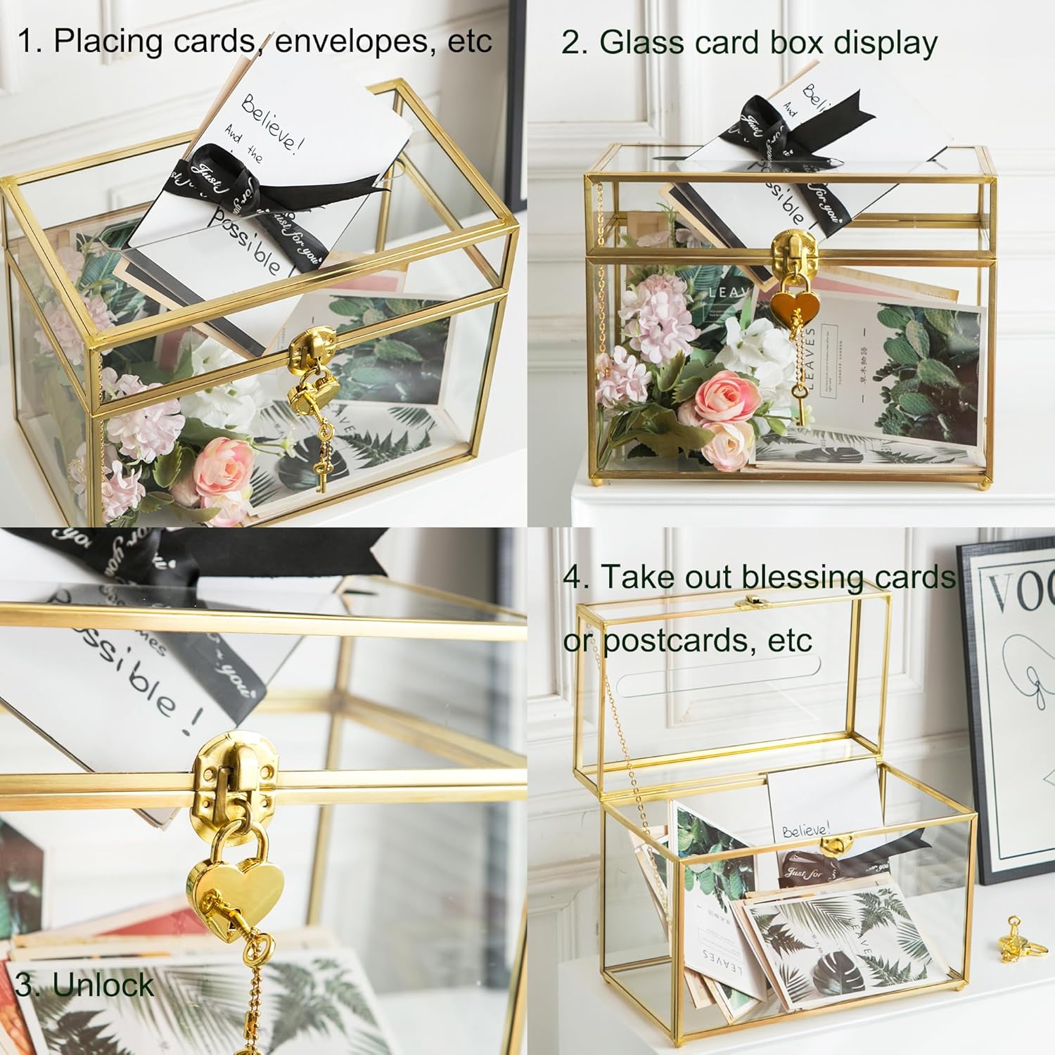 - Gold Wedding Glass Card Box - Add a touch of elegance to your home decor with our stunning Gold Wedding Glass Card Box. Featuring a slot on the top and a lid with heart-shape lock, this glass card holder is perfect for any occasion, from weddings and parties to birthdays and more. The heart-shaped lock with key ensures safe and secure storage of your cards and other precious items.