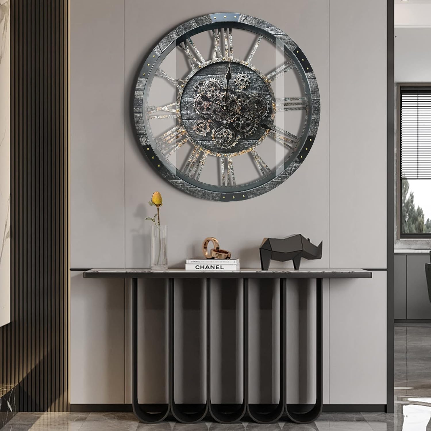 DORBOKER 40" Original Moving Gears Wall Clock, Large Industrial Wall Clock for Living Room Decor,Oversized Wood Vintage Farmhouse Steampunk Rustic Clocks for Wall Decor,Carbon Gray