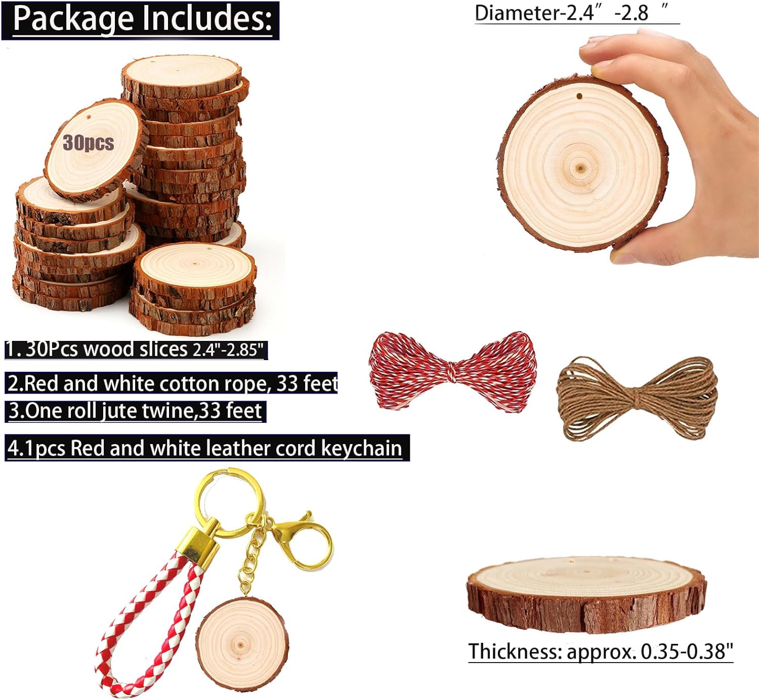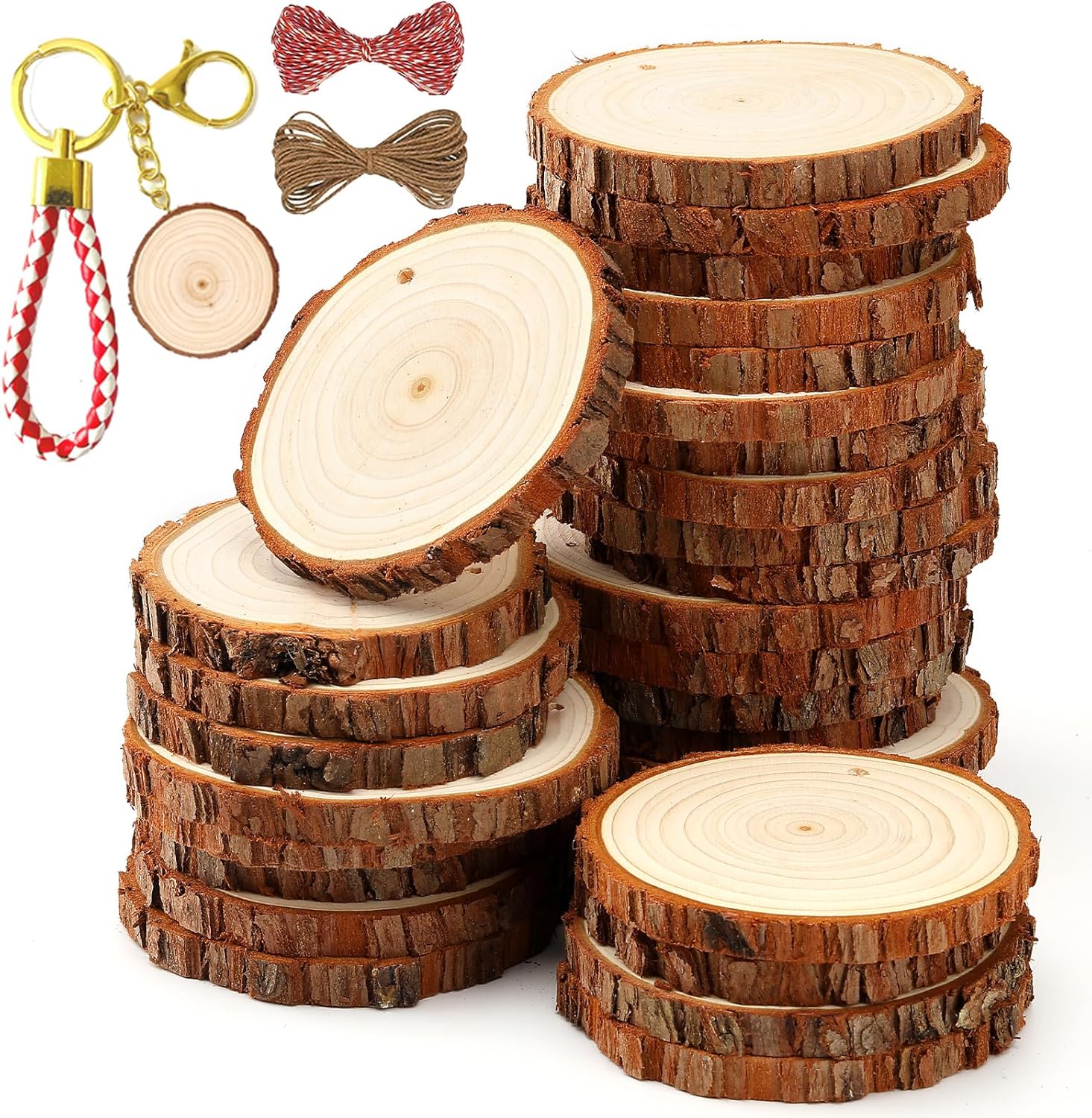- A Rainbow of Possibilities - Our unfinished wood crafts are the perfect blank canvas for your imaginative ideas. Use these wooden circles for crafts to create personalized items or add a unique touch to your home decor. Bonus Keychain Included - Along with 30 wood slices, each package also comes with an additional tree slice attached to a charming keychain . Add a personal touch to your keys or bag, or give it as a thoughtful, handmade gift.