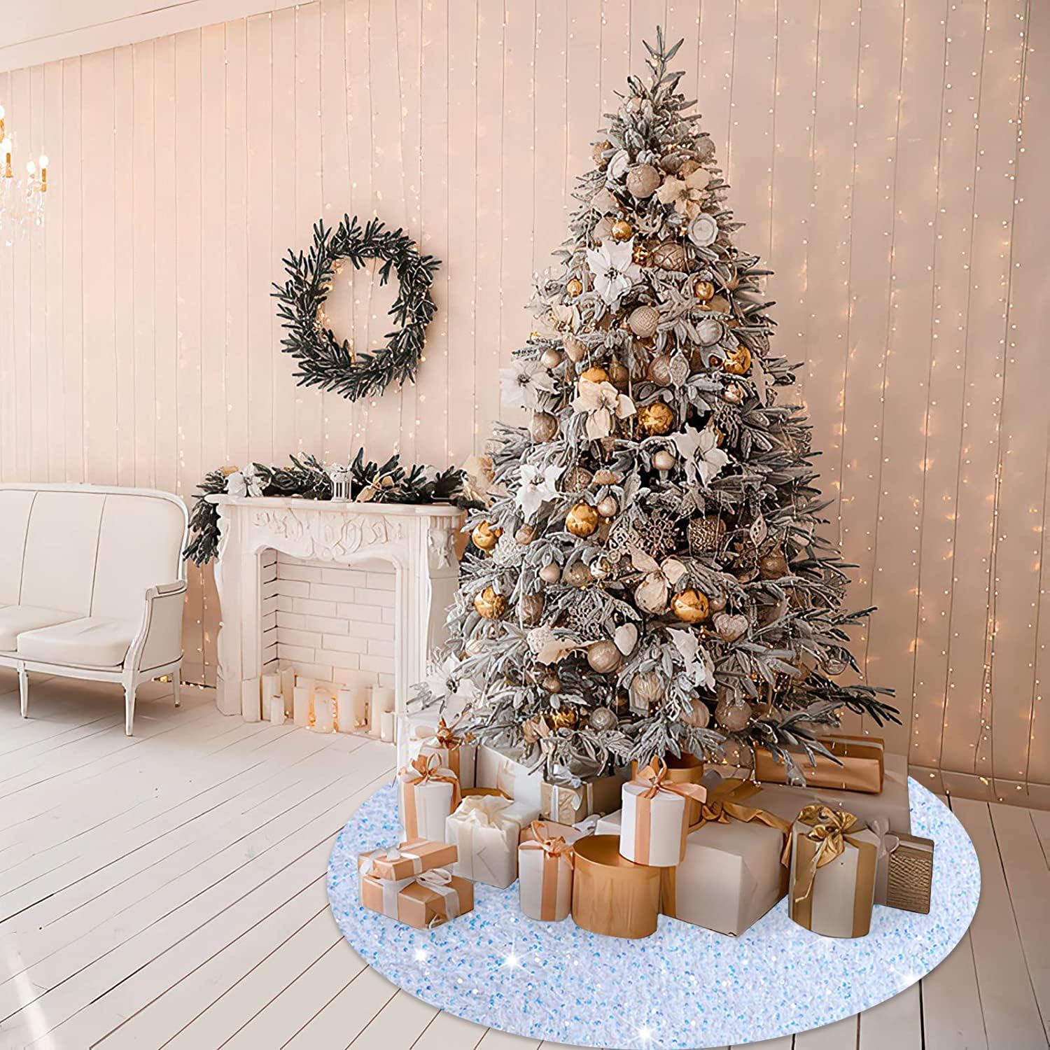 - âď¸ăWidely Application - White Christmas Tree SkirtăThe bling tree skirt great for indoor and outdoor tree decorations, suitable for modern and traditional home style. Great for living room, office, theme party, classroom, supermarket, garden, bar, hotel, and any other scenes. Bring warm and comfortable atmosphere into your home.