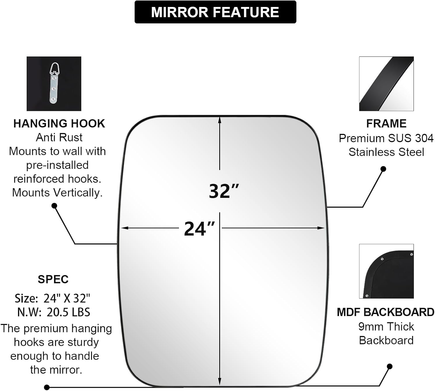 - Maximize Limited Wall Areas: Maximize your bathroom's wall space with the 24 x 32 inch mirror. Its versatile size and clear, distortion-free reflection make it perfect for narrow spaces, offering both practicality and aesthetic appeal in confined areas