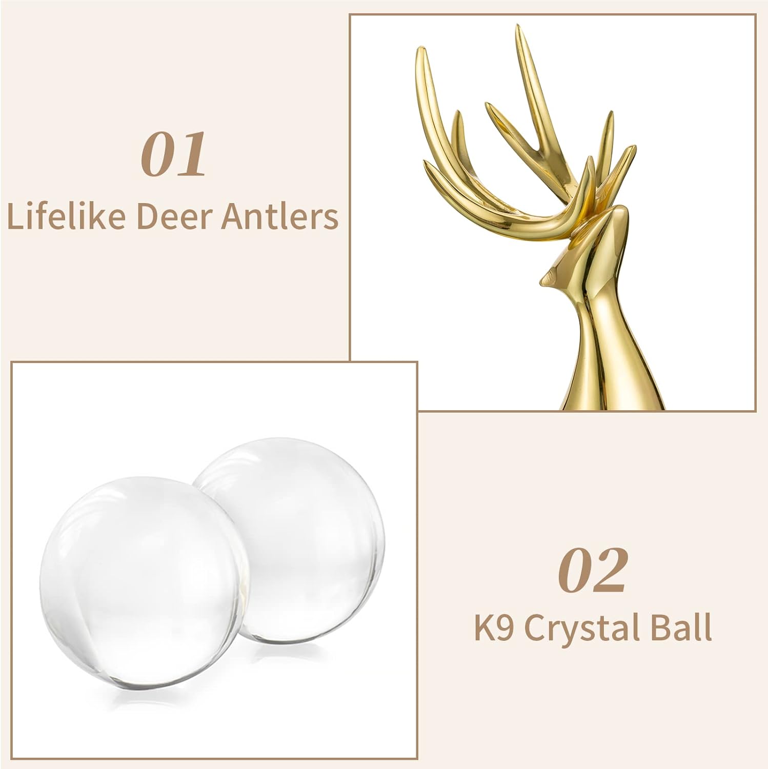 - ABOUT SIZE- The standing reindeer sculptures is about (23.5cm/9.5″ high and 11.5cm/4.5″ wide) and the resting deer statue is about (15.5cm/6.1″ high and 10cm/3.9″ wide), each stag has a 5cm/1.97″ crystal ball on their heads.
