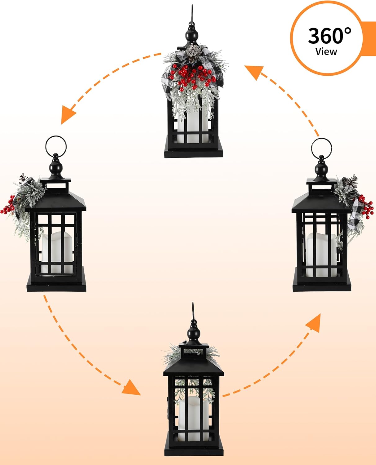 - Elegant and realistic design: This metal black lantern features a white candle inside that looks like a real flame. The lantern is decorated with a festive arrangement of red berries, green leaves, and pine cones on top.