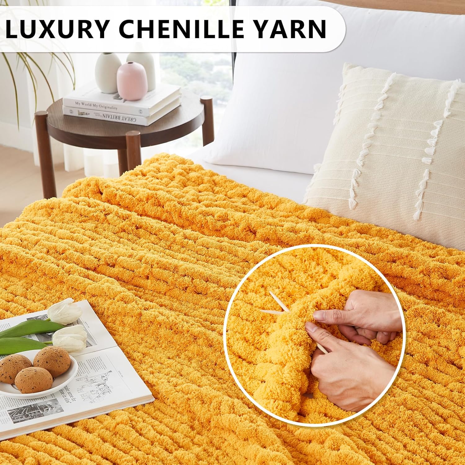 L'AGRATY Chunky Knit Throw Blanket - 40x50: 100% Hand-Knitted Chenile Crochet Blanket For Home Decor (Mustard Yellow)