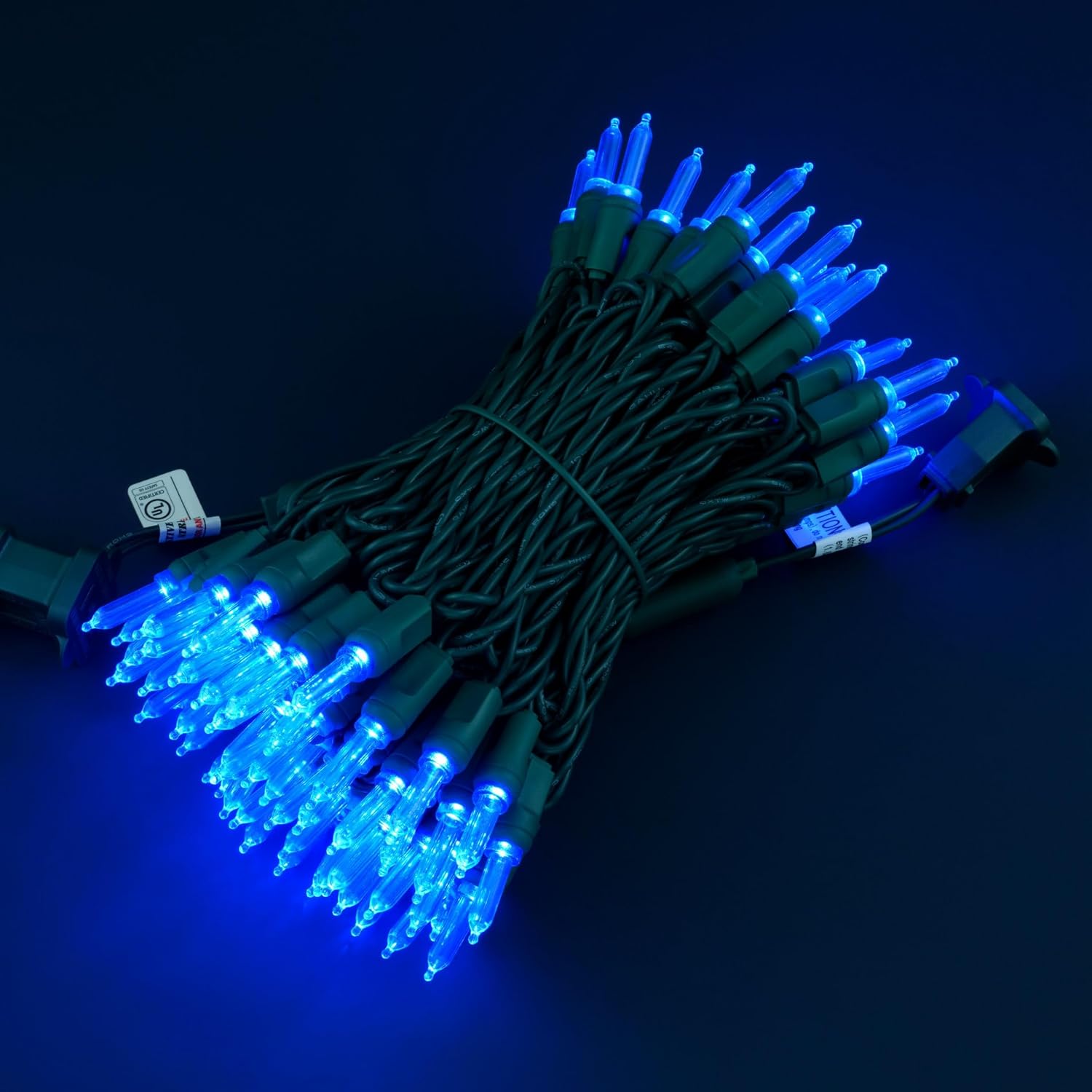 - SPECIFICATIONS β Each pack contains 1 strands of one-piece string lights, total length 33 feet with 100 count blue mini lights. 22 AWG green cord, 4" lead, 4" spacing, 4" tail.