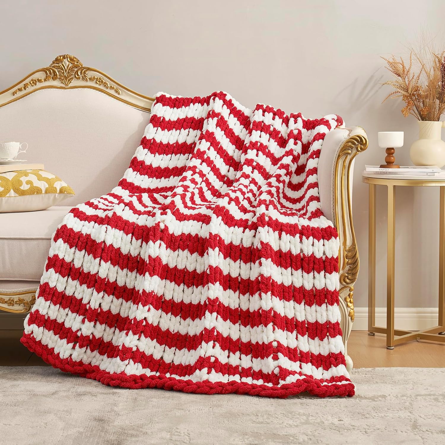 Amélie Home Chunky Knit Blanket Throw, Thick Soft Yarn Chunky Throw 50x60, Handmade Chenille Cable Knitted Crochet Throw Blanket, Warm Rope Knot Blanket for Couch Bed Sofa, Red White Stripe