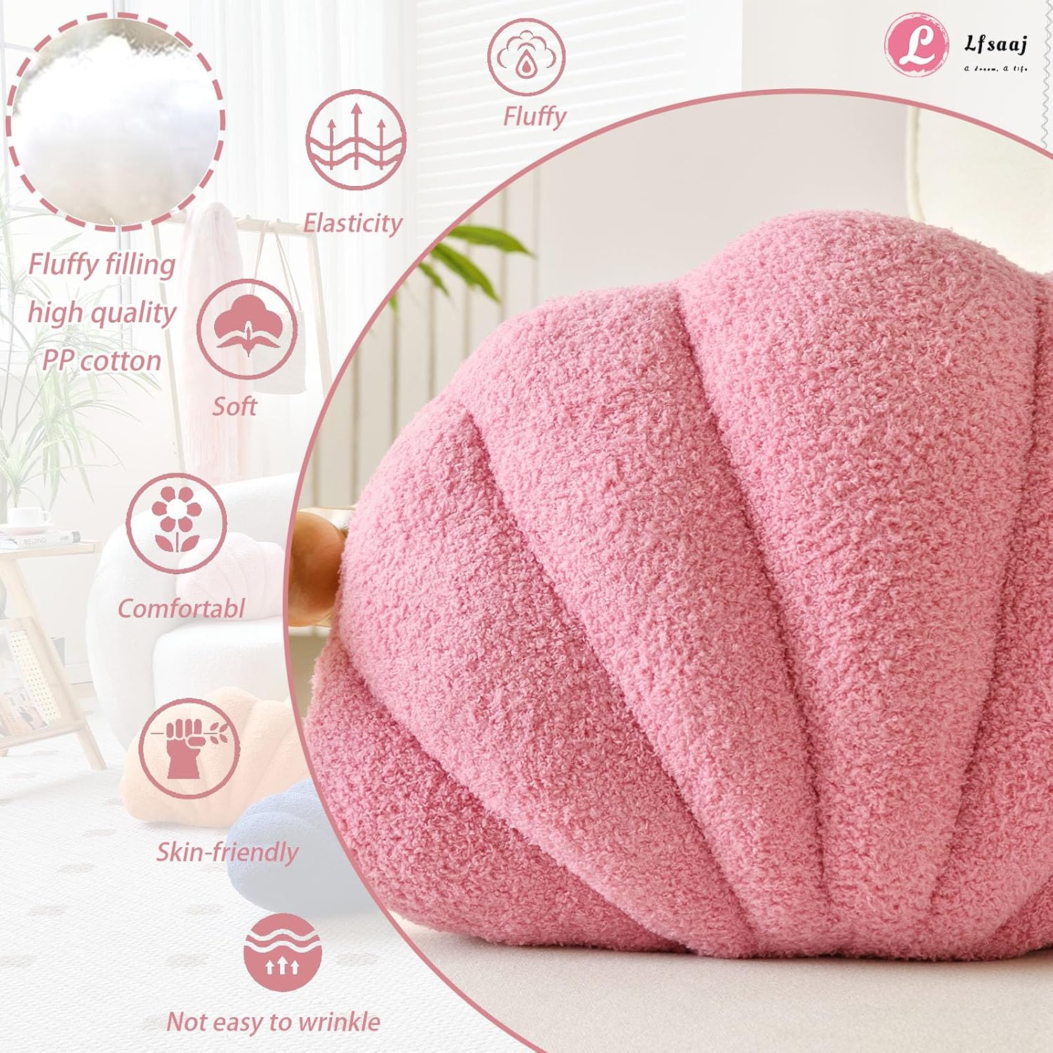 - SOFT MATERIAL: The shell pillow is made of super soft plush fabric, internally filled with high quality fluffy PP cotton, full and comfortable elastic, nicely made, comfortable touch is very friendly to the skin.