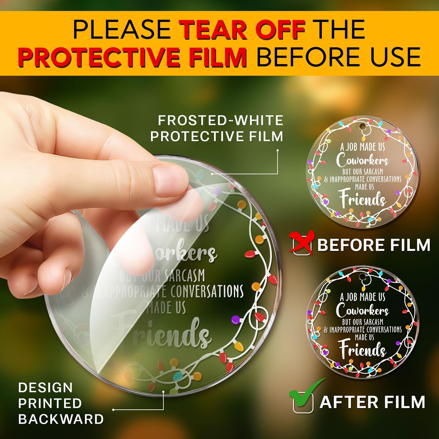 - ACRYLIC MATERIAL: Made from acrylic with a transparent protective film on the front to prevent scratches. The design is printed on the back, and to fully appreciate the ornament's beauty, remove the protective film to reveal the clear acrylic finish