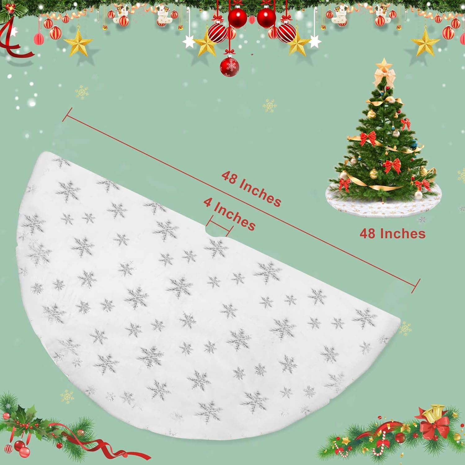 Christmas Tree Skirt, 48 Inch White Luxury Faux Fur & Silver Sequin Snowflakes, 4ft Xmas Tree Skirt for Holiday Tree Ornaments Christmas Party Home Decorations