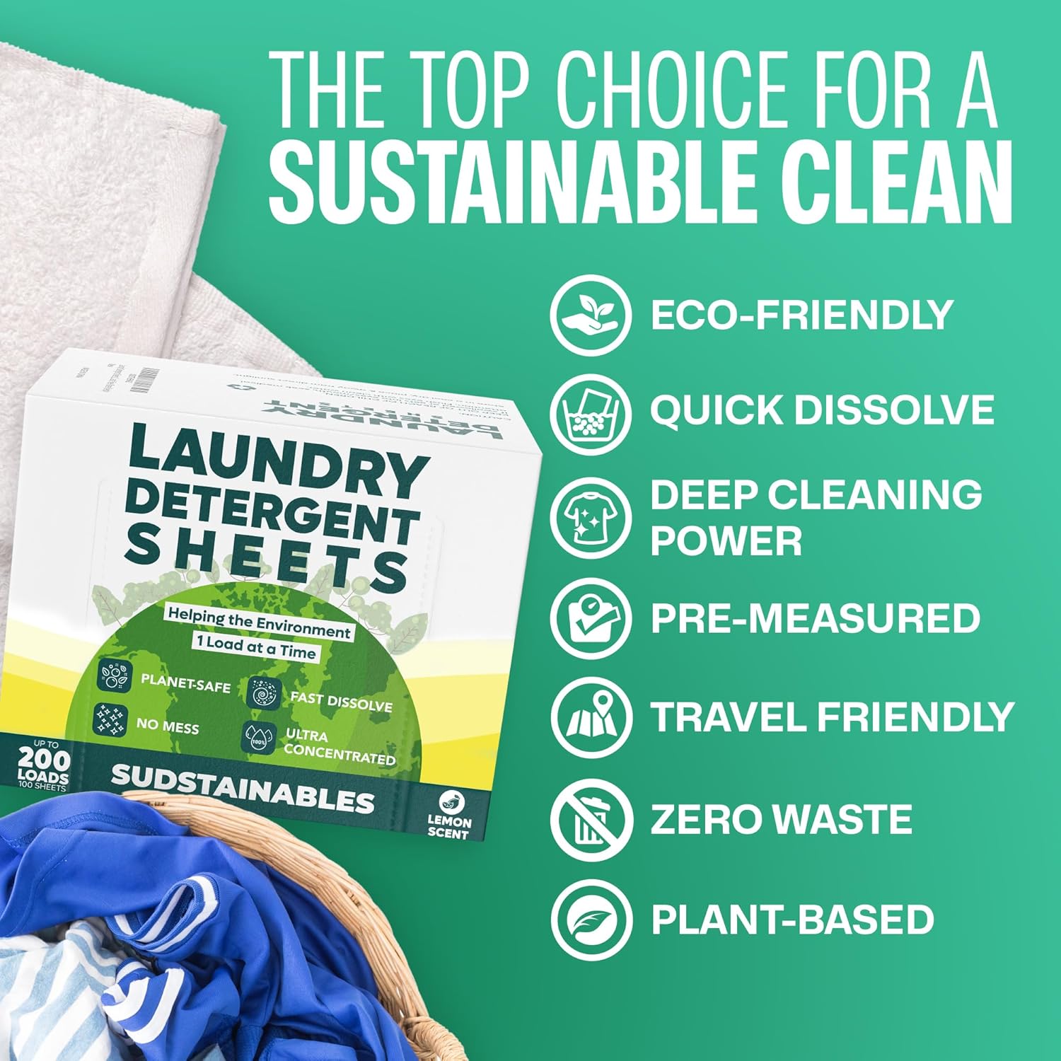 Sudstainables Laundry Detergent Sheets (200 Loads) – Eco-Friendly, Zero Waste, Plastic-Free Laundry Washing Machines Soap Sheets; Dissolvable, Space-Saving Strips for Travel (Lemon)