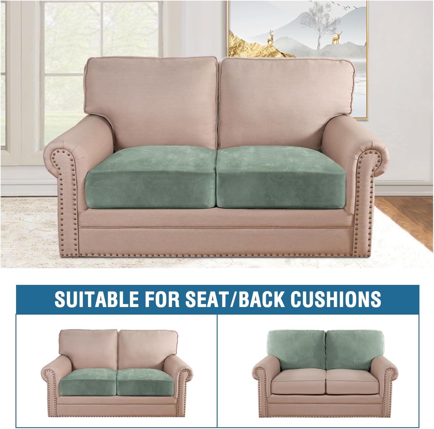 H.VERSAILTEX Velvet Stretch Couch Cushion Cover Plush Cushion Slipcover for Chair Loveseat Sofa Cushion Furniture Protector Seat Cushion Sofa Cover (2 Piece Large Sofa Cushion Covers, Sea Grass)