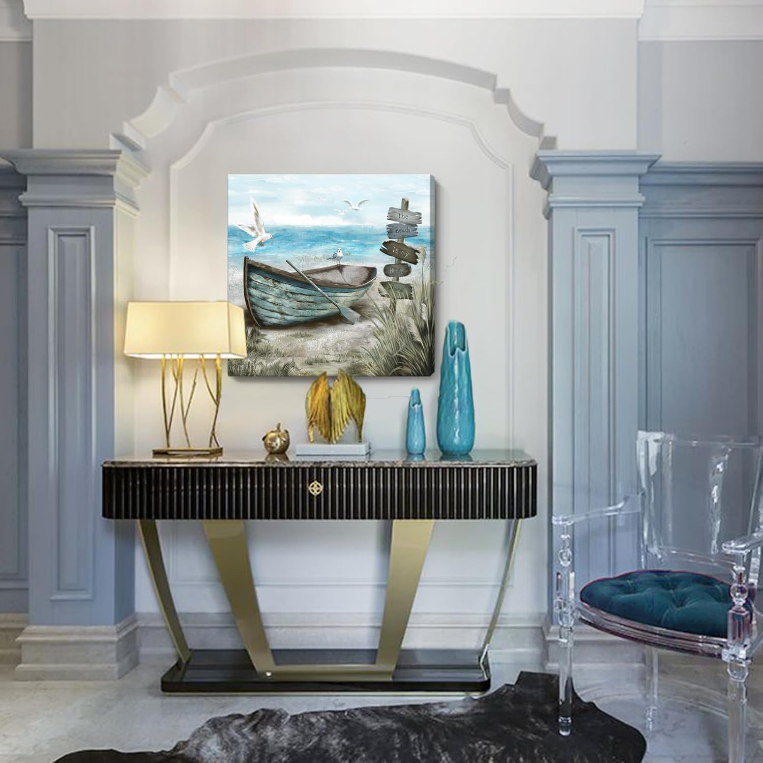 - Calming Seashore Aesthetic: This serene coastal decor themed canvas wall art captures sea bird resting on the rowboat. Behind the boat is blue ocean with the soaring seagulls. The nautical palette of blues, sand beige, teal, and fluffy white clouds provide a soothing feel. Hang this beach wall art up for a calming vibe, and escape to the beach each day after work in the comfort of your home.