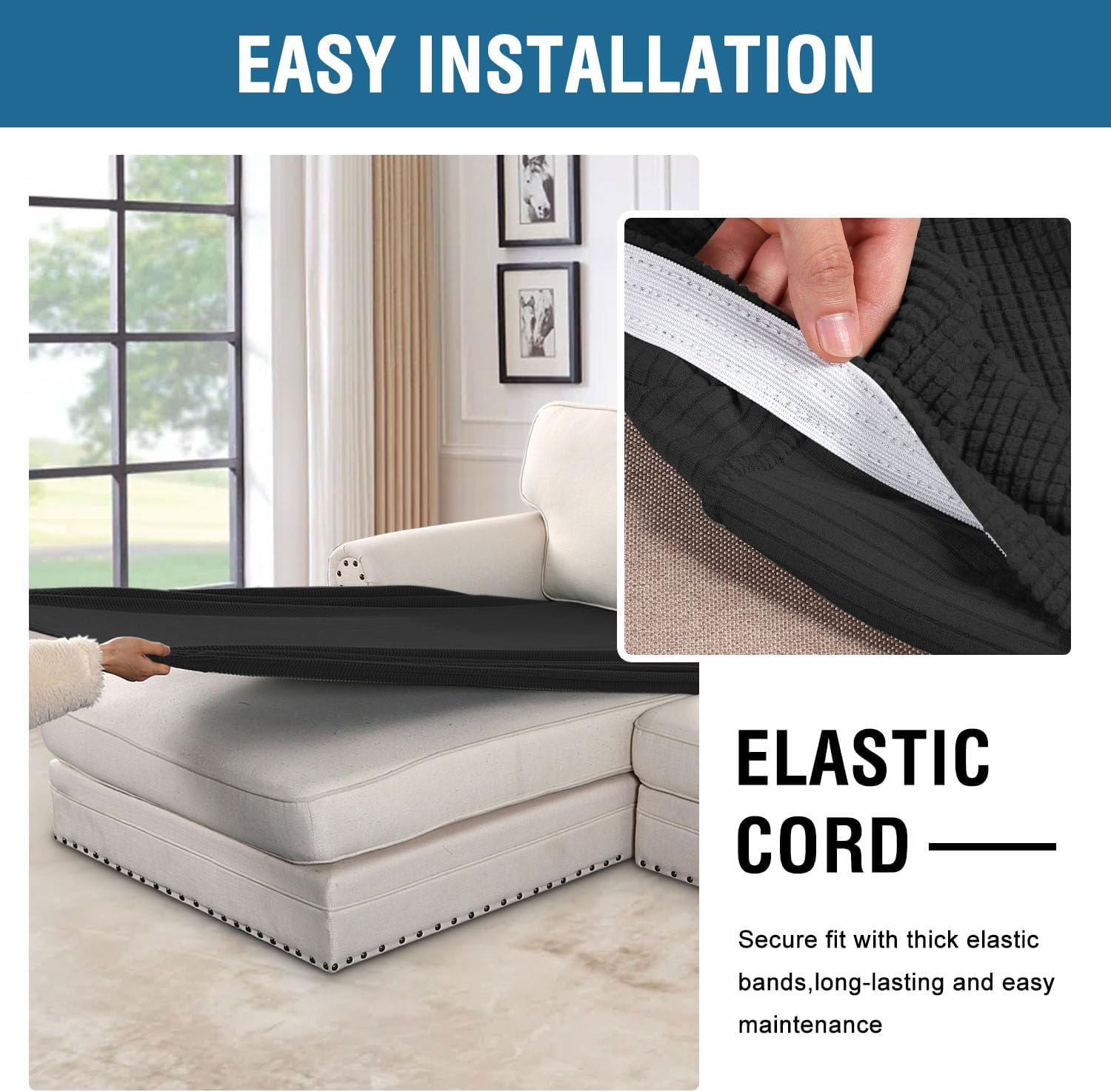 - NON SLIP: Effortless for installation (guide photos on selling page), sewn with thick elastic loops to cover the bottom edges. It is easy to install and take off, making your home more harmony, high recommended for both leather and cloth furniture