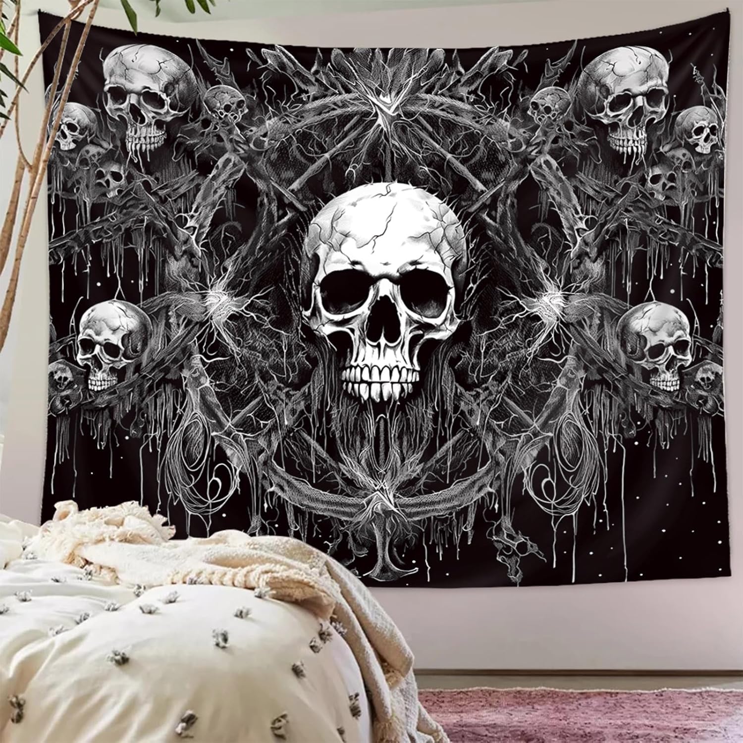 - Intricate Design: Featuring a detailed skull design with swirling patterns and wiry branches, this dark witchy tapestry adds a touch of grunge and mystery to any space.