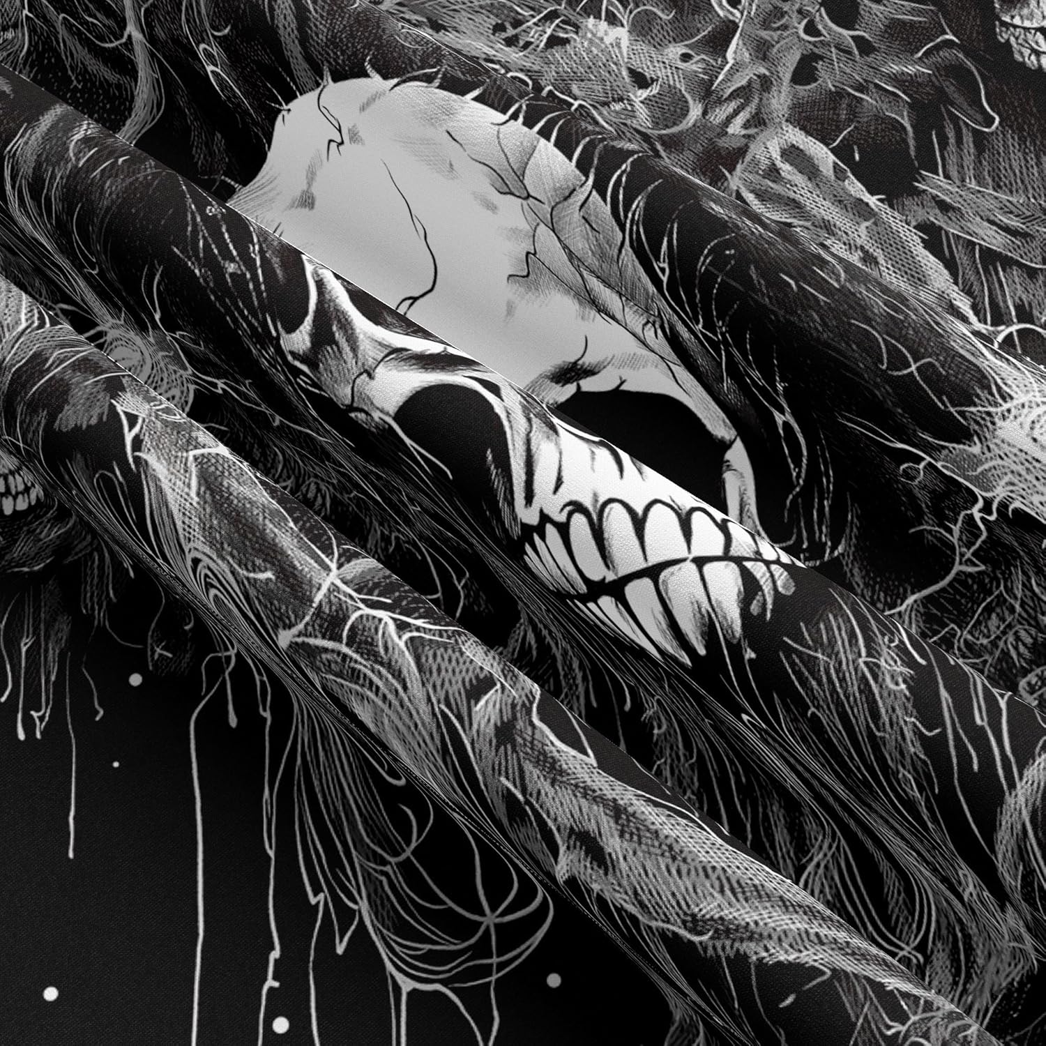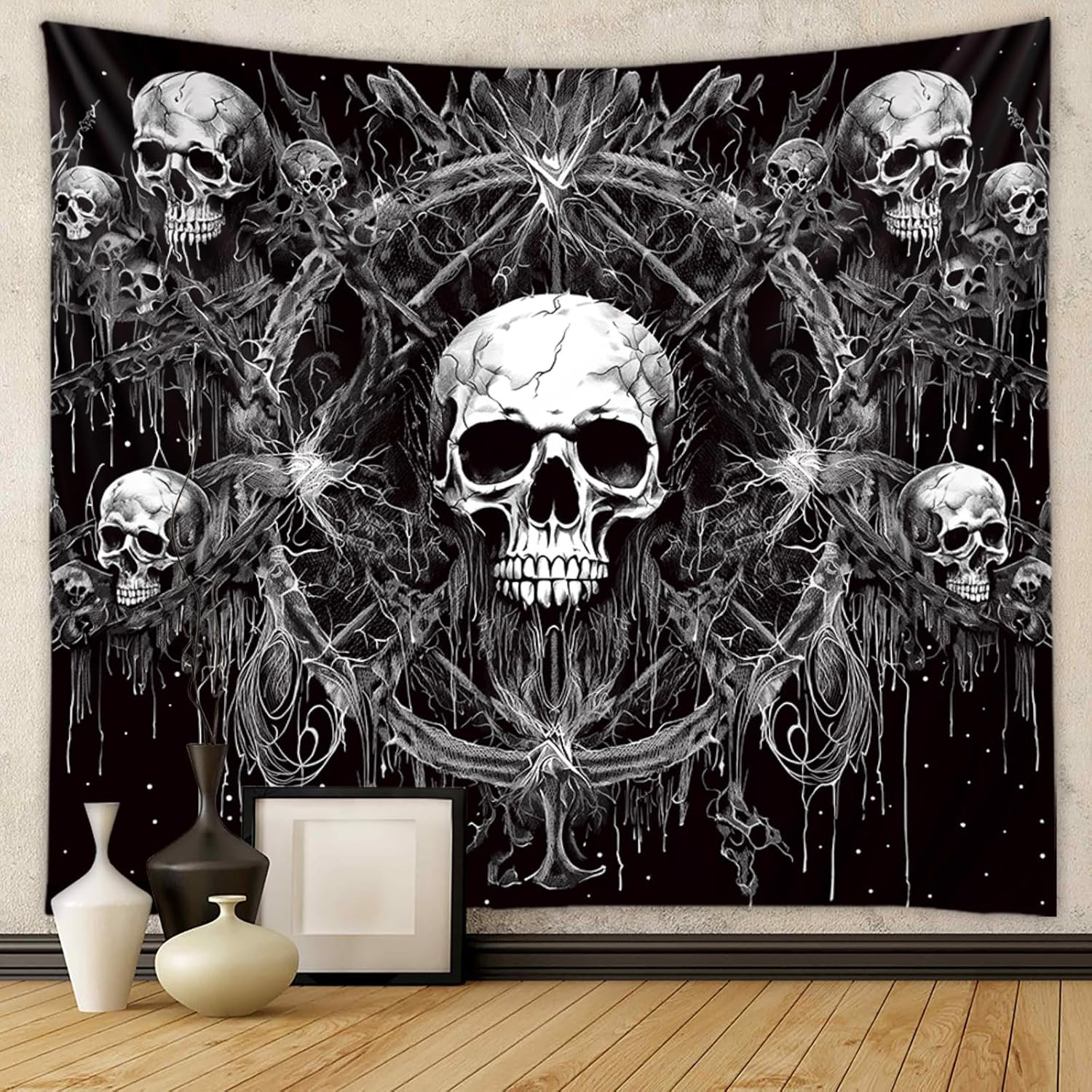 - Dark & Gothic: Made from high-quality black material, this Skull Tapestry adds a sleek and spooky touch to any room. Perfect for those who love all things dark and gothic.