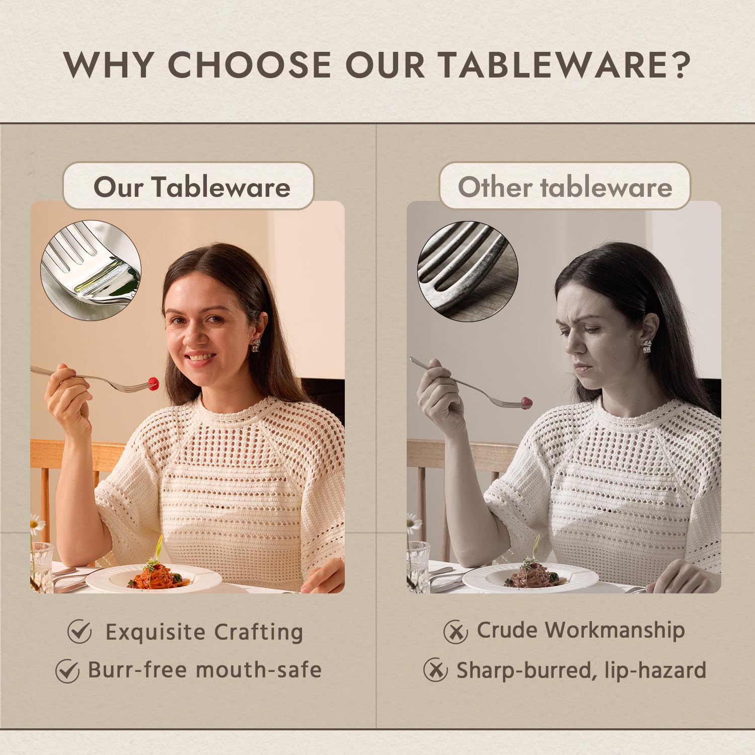 - TOP WORKMANSHIP:This tableware use more than 10 times handcraft polishing instead of machine polishing to make the surface like a mirror. High-temperature forging technology enhances the hardness of the material and will not bend or deform.