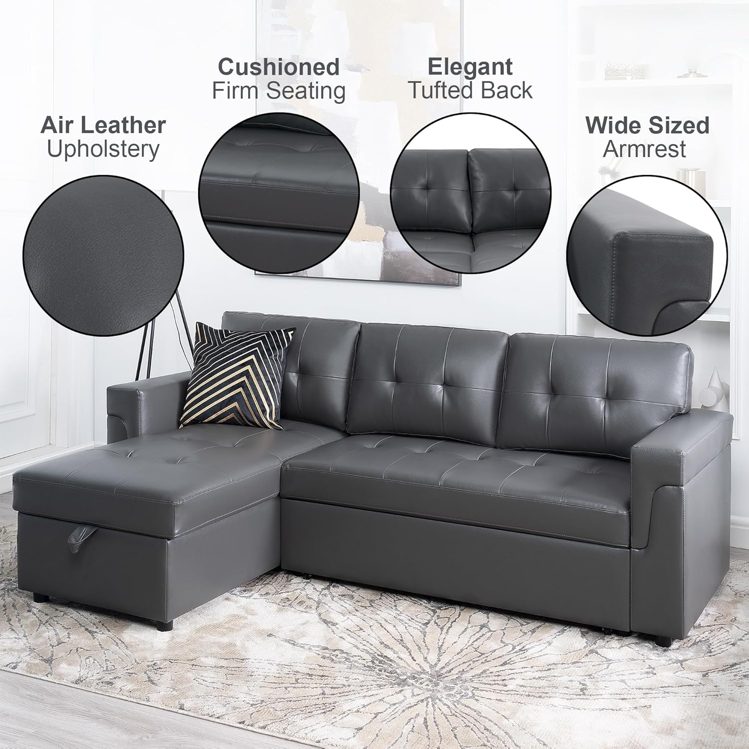 Naomi Home Transform Any Space: Sleeper Sectional Sofa with Convertible Sofa Bed & Inviting Chaise. Find Tranquil Comfort with Stress-Relieving Design & Durable Cushions - Dark Gray/Air Leather